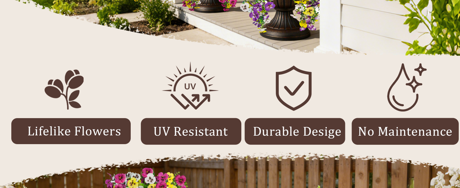 Premium Materials: Crafted from high-quality silk and flexible plastic, our artificial hanging pansy flowers for outdoors boast realistic textures and rich color palettes. Each fake pansy comes with a bendable stem for easy assembly, allowing you to adjust and mix with your favorite bouquets as desired. Most importantly, they're made with pet-safe materials, ensuring worry-free decor for homes with furry friends