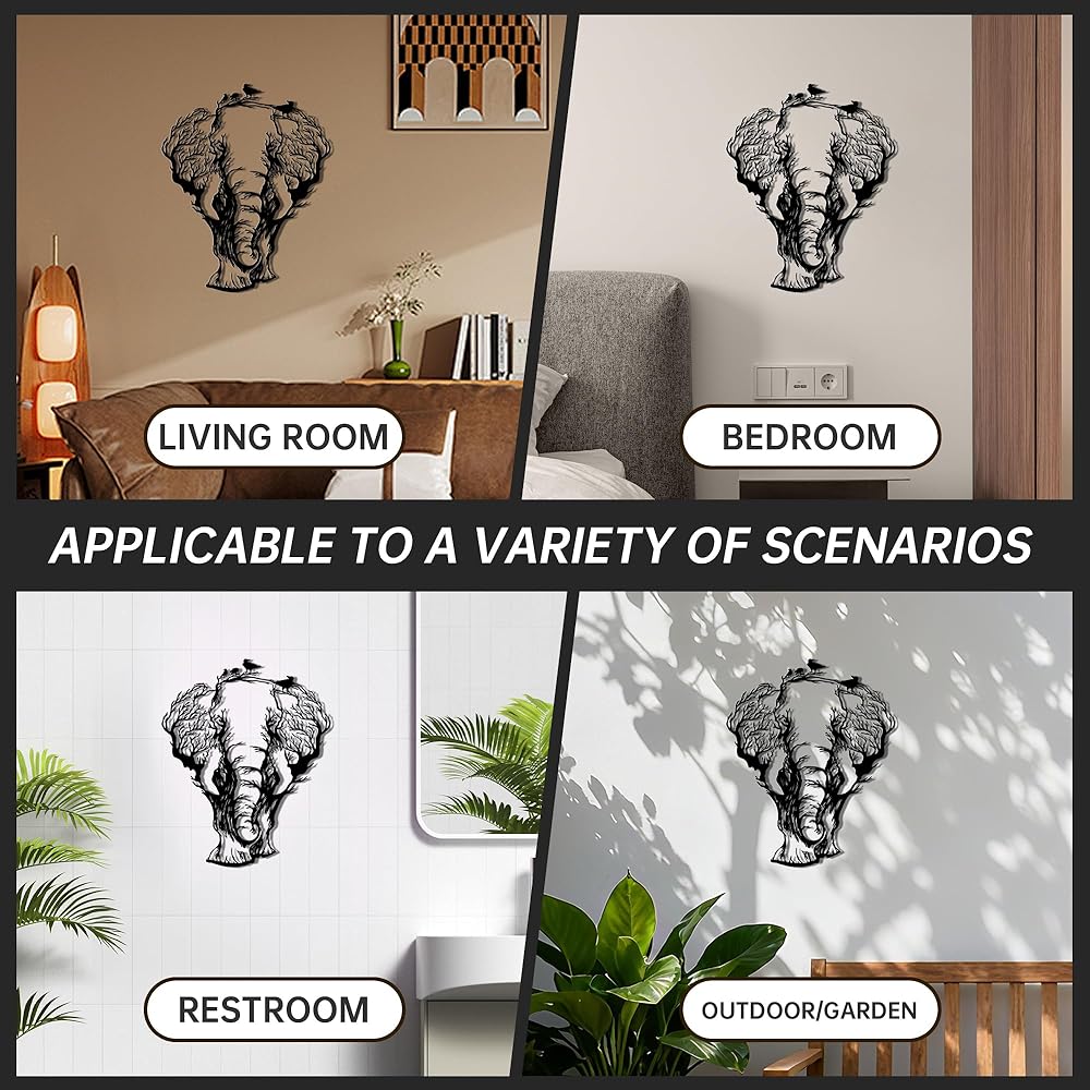 Expertly fashioned from 1mm matte black metal with waterproof coating, this durable elephant wall decor maintains its striking appearance whether displayed indoors as part of your african decor for home collection or outdoors in garden and patio areas. The pre-drilled hanging holes ensure effortless installation, allowing you to quickly enhance living rooms, bedrooms, bathrooms, or create an impressive african art wall decor statement in office spaces.