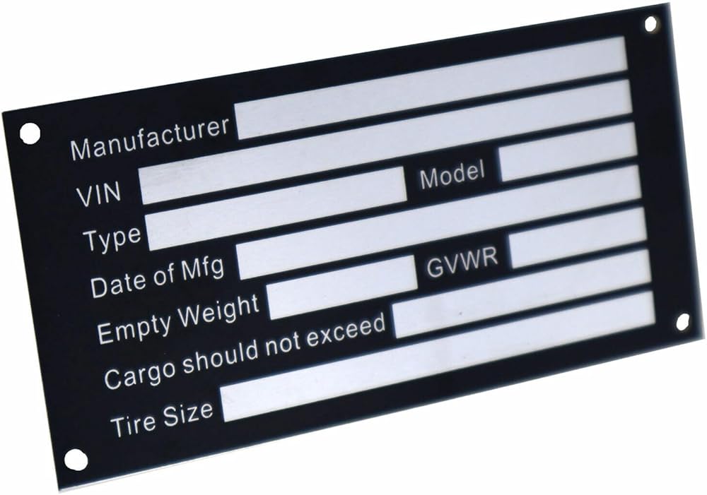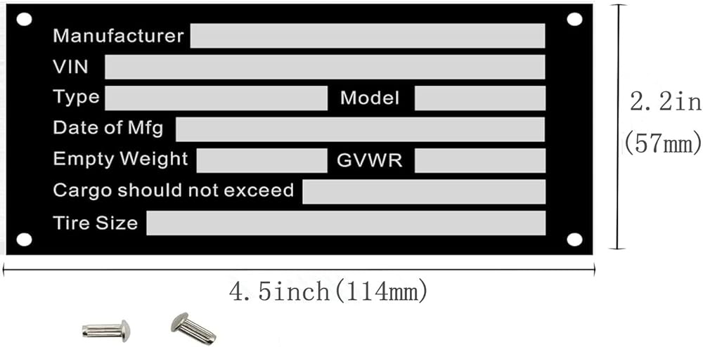 The tag measures The tag measures 4.5inch x 2.25inch (114mmX57mm) Tag is made of anodized aluminum with screen printed outdoor UV resistant inks. Our tags are manufactured directly by us. We use top of the line machinery to produce these tags for business and industrial customers and the serial number is produced with computer controlled machinery that cuts down into the tag making the number a permanent part of the tag. Others who offer a printer or laser produced number will fade as they are on the surface of the tag instead of cut down into the metal. Our numbers come out in a straight line as well as we do not use hand stamping that can cause defects. Please be sure to all the information is right before you order it, for the customs item we won't accept return once the item has been made. It included Title: Manufacturer VIN Type Model Date of Mfg Empty Weight GVWR Cargo should not exceed Tire Size We are the Factory Make ALUMINUM Plate, so we can accept special order, if you have special need. please feel free to contact us and tell us what you need. hope to chat with you.