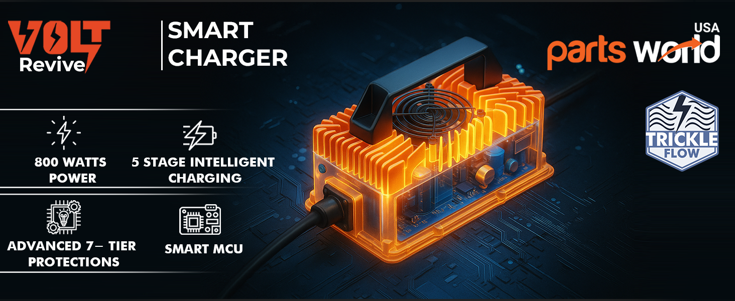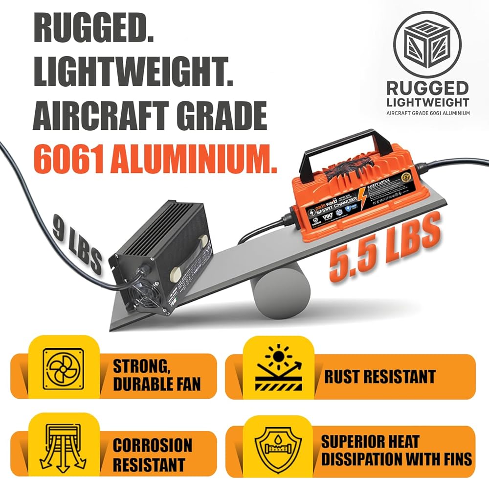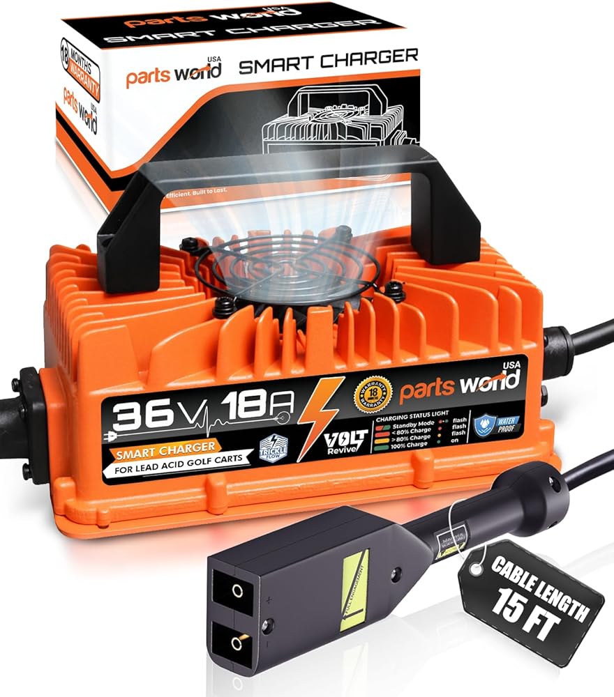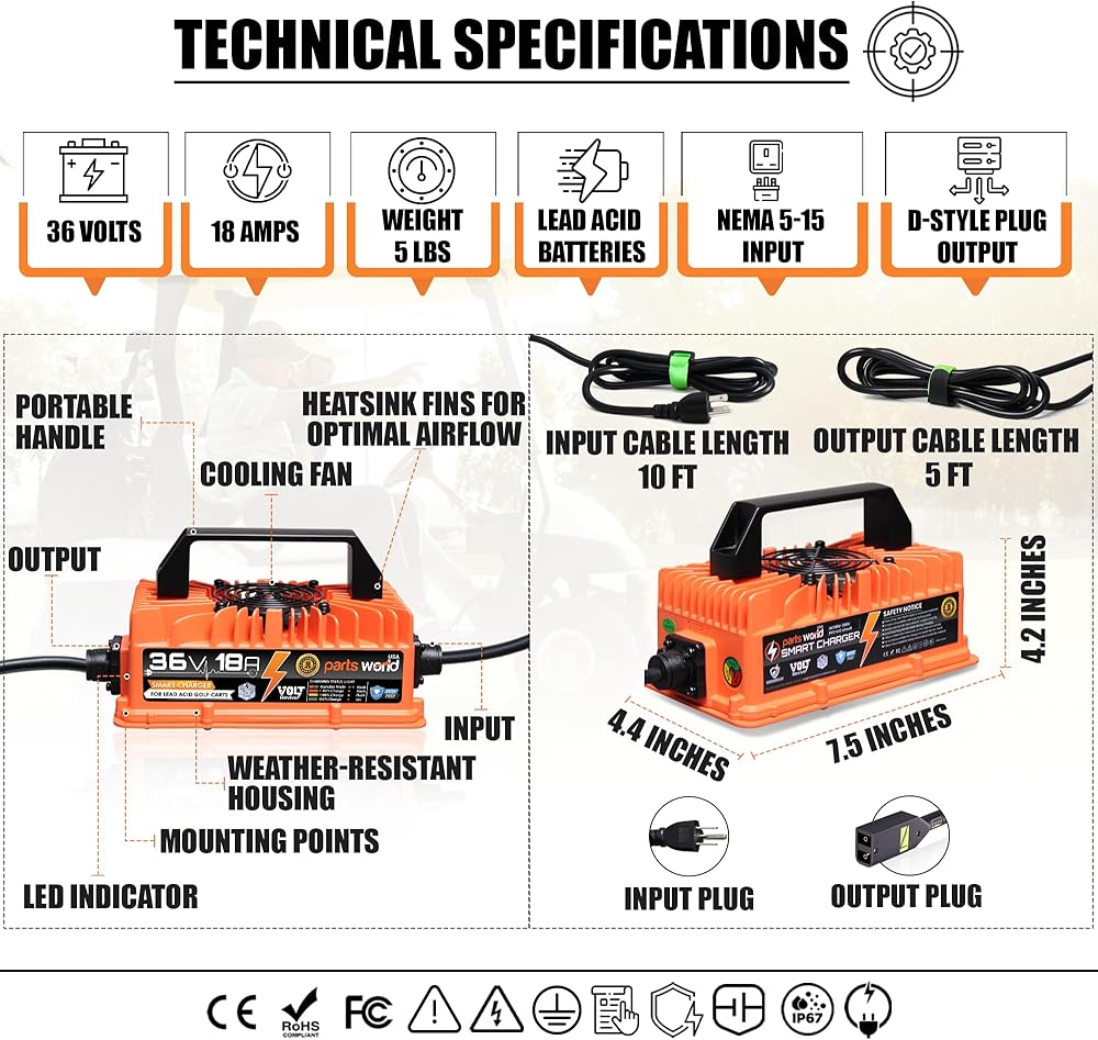 36V VoltRevive Golf Cart Charger – Fast charging and reliable performance with a durable D-Style plug. 80% lighter than OEM models and includes a 16ft cable for hassle-free charging and maximum reach.