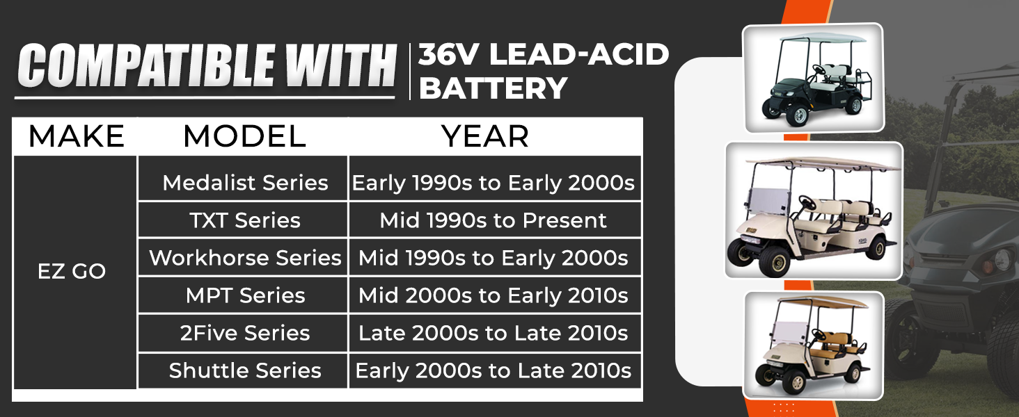 Compatible with 36V EZGO golf carts using the Powerwise “D” style plug, this charger supports models including EZGO TXT, TXTE, TXT PDS, Freedom TXT, Shuttle, Medalist, 2Five, MPT Series and Workhorse Series.