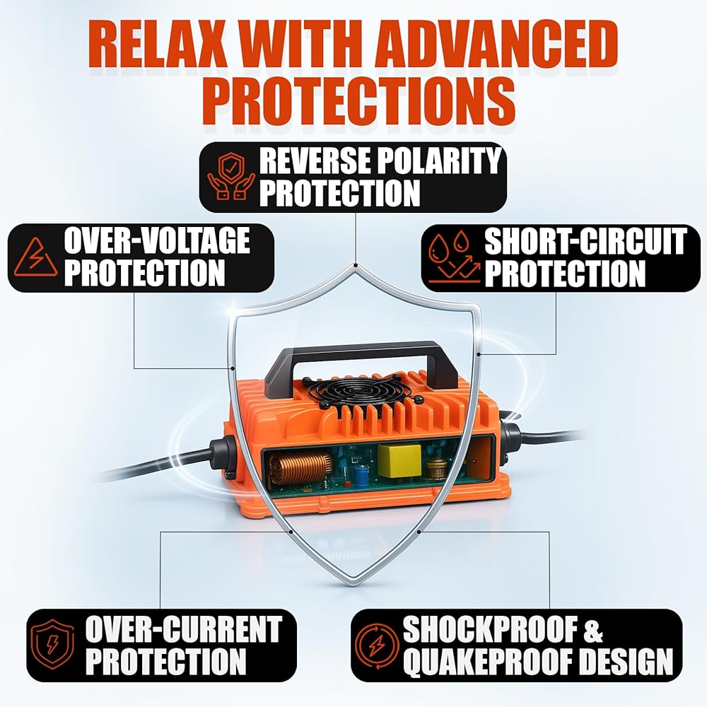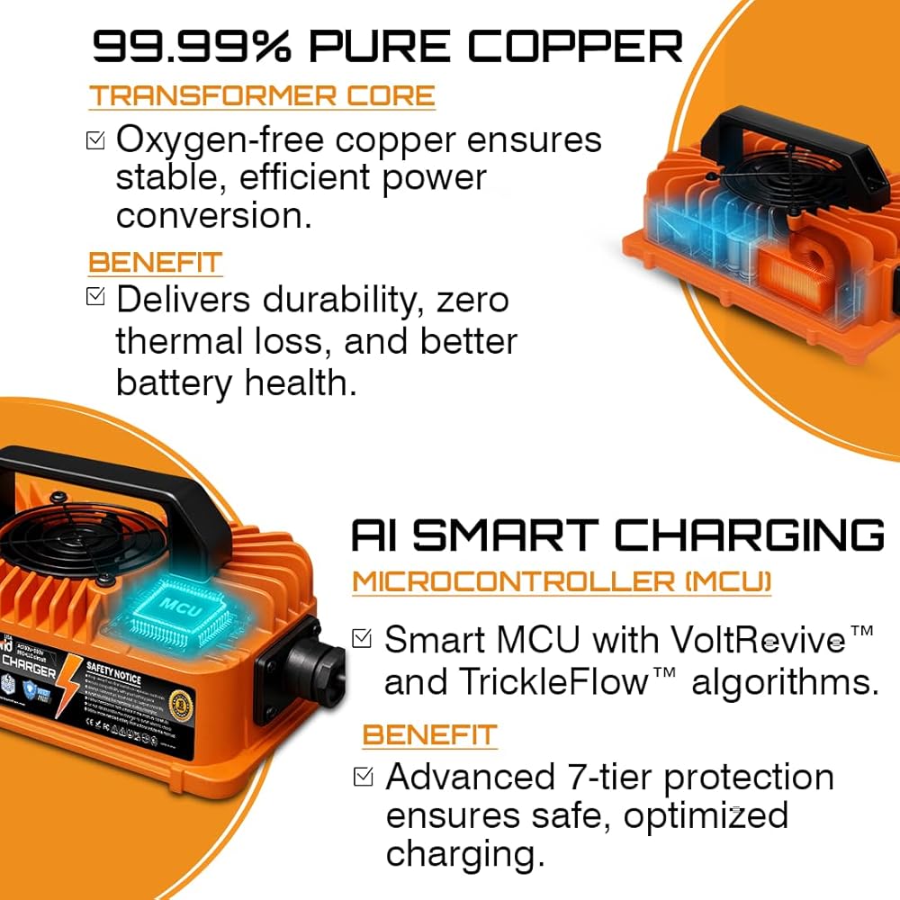 Equipped with advanced MCU control and Active PFC-LLC design, this charger ensures high efficiency, exceptional stability, and safety with built-in protections against over-voltage, over-current, short circuit, reverse polarity, and overheating.