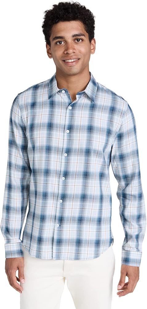 Our classic fit long sleeve shirt features a subtle plaid in a cotton rayon blend for comfort and an easy drape. Can be worn alone or layered. Button through front. Button cuffs. Shirttail hem.