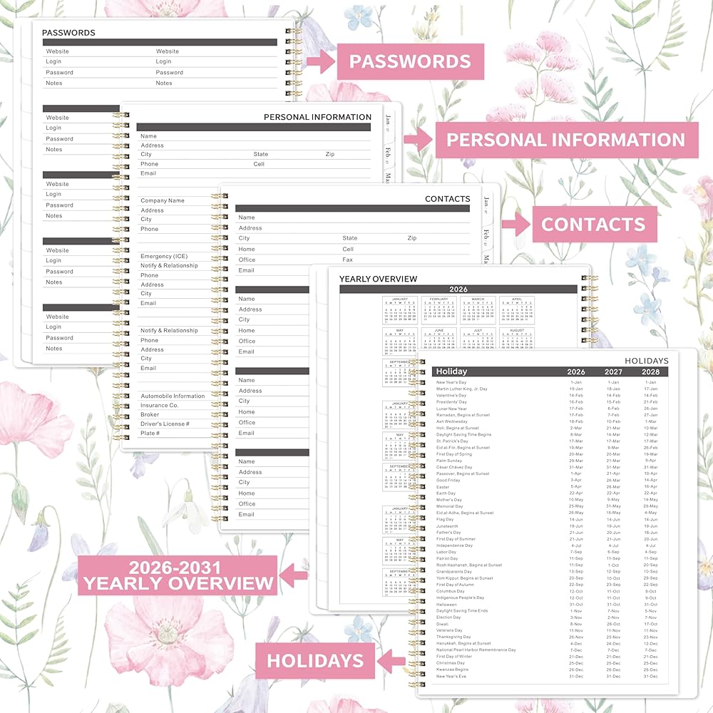 EXTRA FUNCTION PAGES - The monthly planner 2026-2031 involves 6 kinds of extra functional pages, including quick reference information page, 6 yearly overviews, 6 years holiday overview, contact page, Password page, notes page. The monthly calendar 2026-2031 can absolutely meet your various information recording needs.