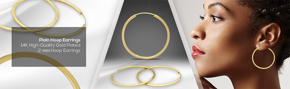 Made of high-quality 14K Gold-Filled copper our Plain Women Round Hoop Earrings are hypoallergenic, tarnish resisting, and will hold their shine for years to come. 14K Gold Hoop Earrings for women are 2 mm thick and come in six diameter sizes: 25 mm, 30 mm, 40 mm, 50 mm, 60 mm, 70 mm and have a high polished finish that gives a shiny look and a perfect fit for everyday wear. The Continuous Clasp ensures a secure fit and easy removal of hoop earrings. Hoop Earring Jewelry is available in multiple sizes, you can find the perfect set to suit your personal taste. The contemporary design of our fashion jewelry suits both casual and special occasion outfits. All BEBERLINI women's jewelry is packed in our brand jewelry box and will make a perfect gift for a girlfriend, mother, daughter, sister, or just a friend.