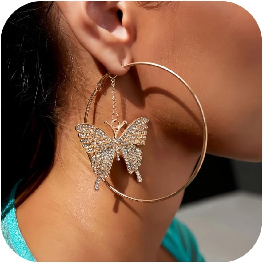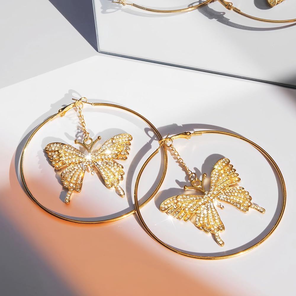 Diamond Butterfly Large Hoop Earrings for Women Party Sparkly Statement Earrings Gold Monarch Butterfly Dangle Earrings for Mom and Wife