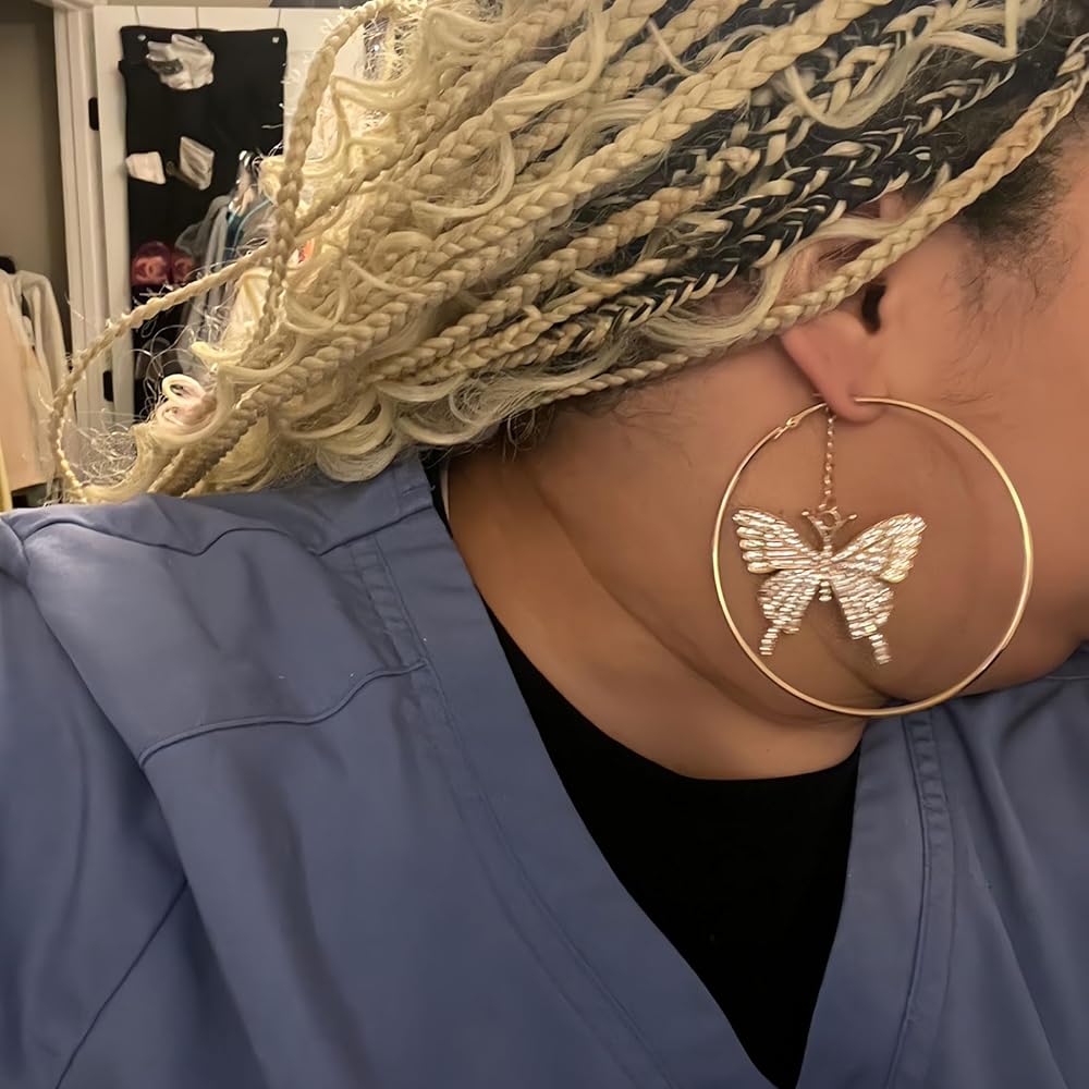 • Materials and Craftsmanship: Crafted from gold-plated alloy and inlaid with diamonds, the butterfly design features exquisite details and sparkling rhinestones. The large hoop earrings have a gold-plated alloy frame, offering a luxurious feel and resisting oxidation and fading. The craftsmanship is robust, and the butterfly pendant is lively and eye-catching when worn, presenting a sophisticated and dazzling visual effect
