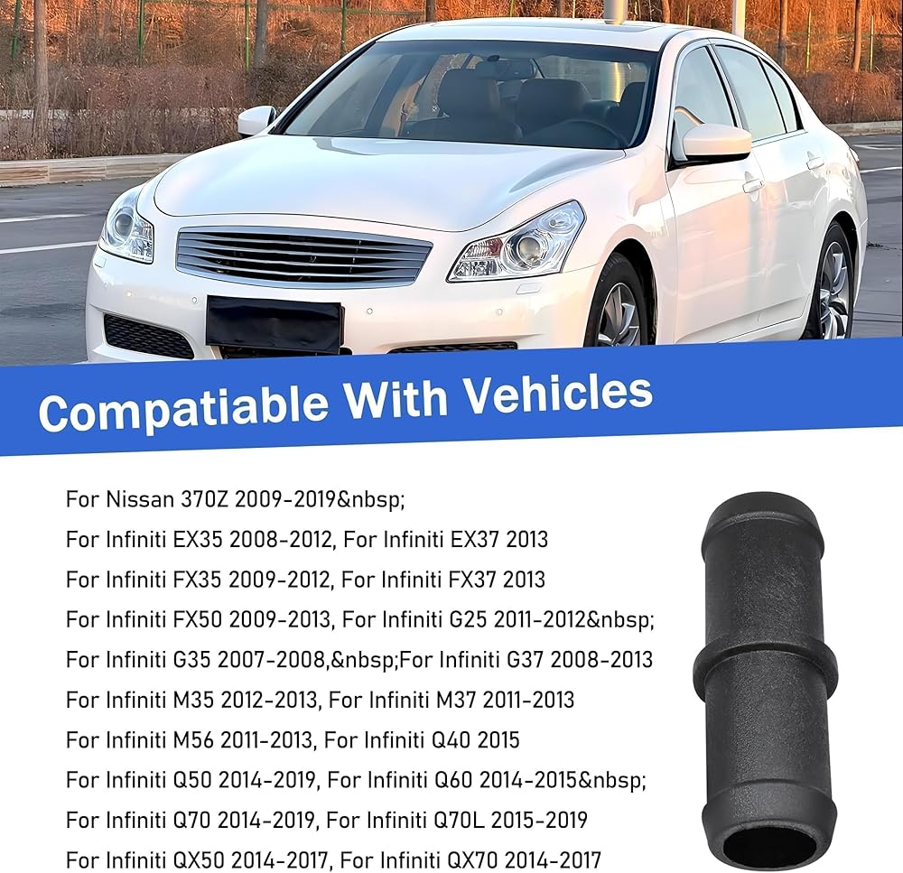 【Fitment】The Heater Hose Connector fit for 2008-2013 Infiniti G37 coupe (CV36), for 2014-2016 Infiniti Q60 coupe (CV36), for 2009-2013 Infiniti G37 convertible (HV36),for 2015 Infiniti Q40 sedan (V36), for 2014-2015 Infiniti Q60 convertible (HV36), for 2007-2008 Infiniti G35 sedan (V36), for 2009-2013 Infiniti G37 sedan (V36), for 2011-2012 Infiniti G25 sedan (V36), for 2008-2012 Infiniti EX35 (J50), for 2013 Infiniti EX37 (J50), for 2009-2012 Infiniti FX35 (S51), for 2013 Infiniti FX37 (S51)