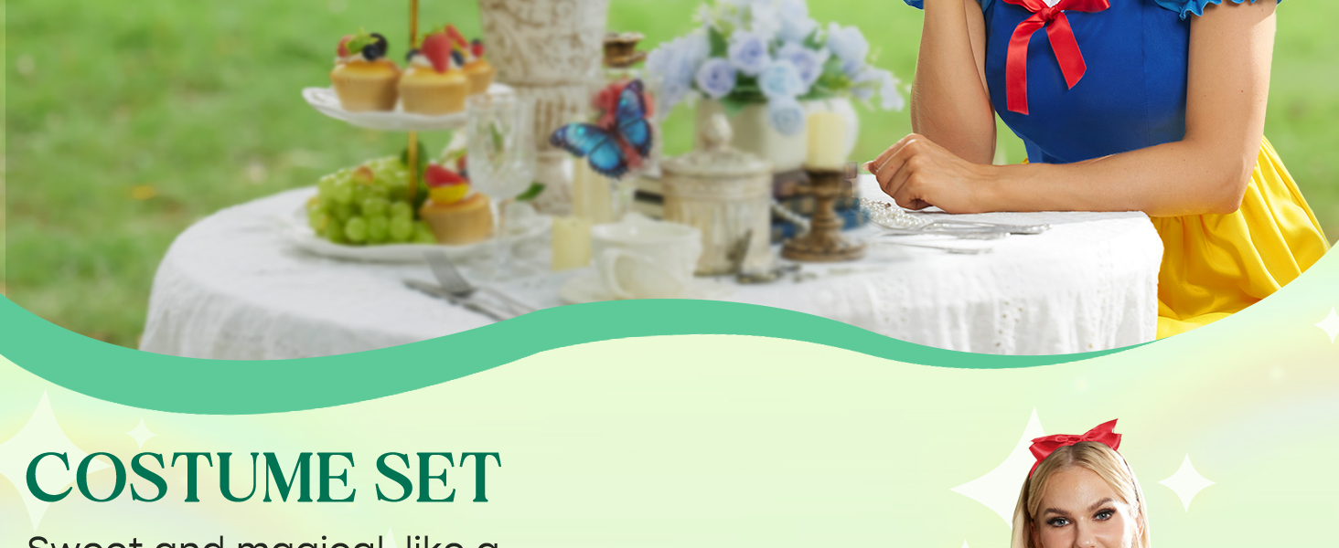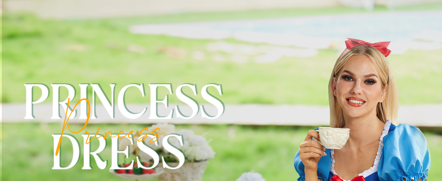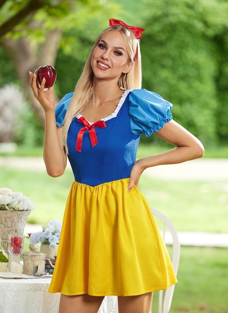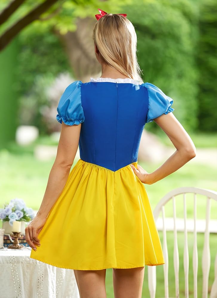 Adult Princess Style SNO White Cosplay Dress for Halloween with Puff Sleeves and Red Bow Headband S