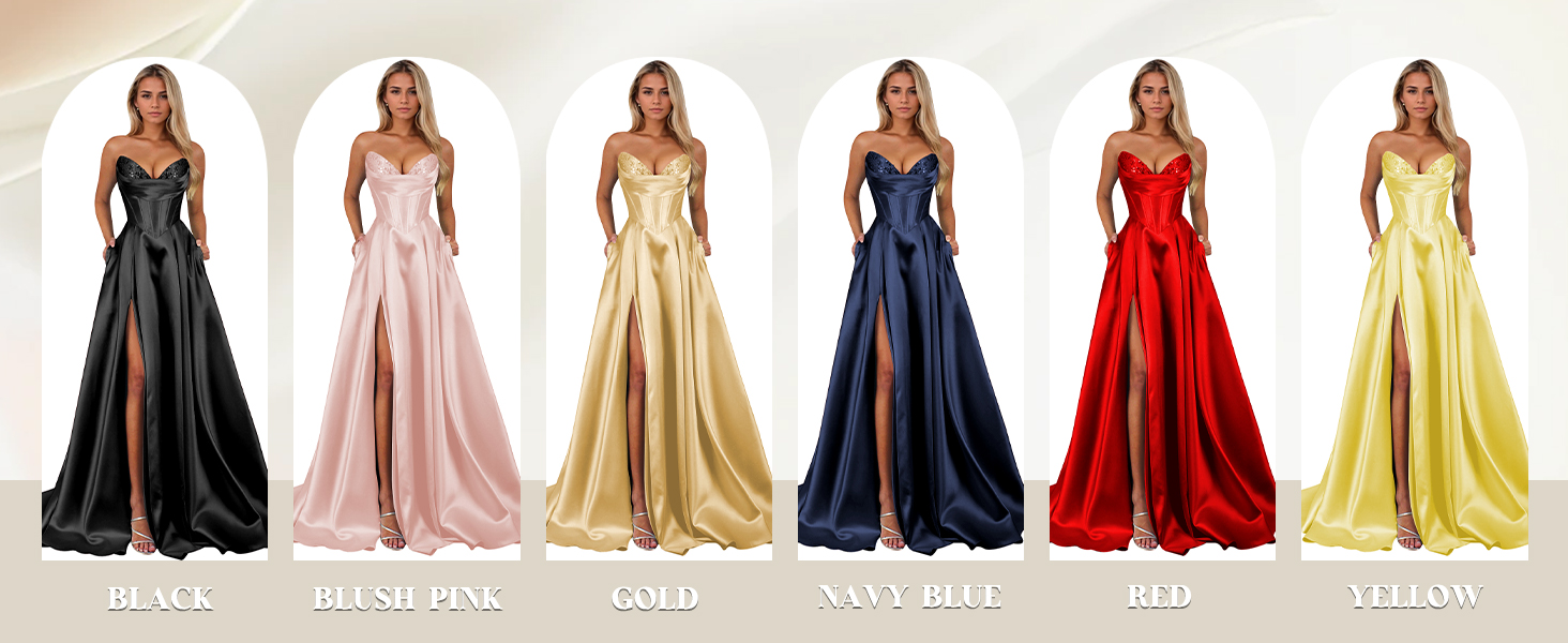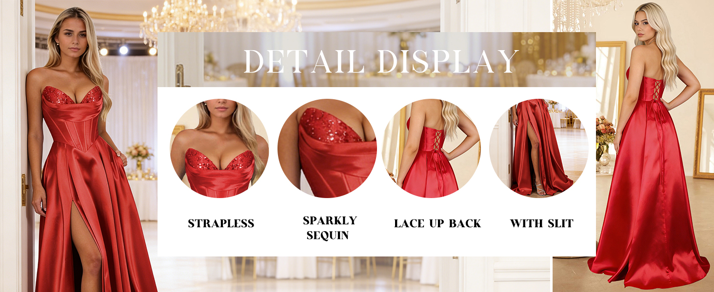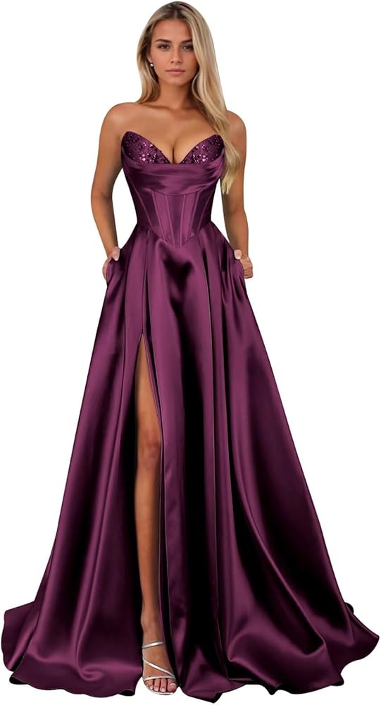 Design:Sparkly Satin Sequin Prom Dresses for Teens,A Line Prom Dresses for Women 2026,Strapless Prom Dress with Slit,Corset,Long,Ruched,Pleated,Floor Length,Bodycon,Lace up Back,Built-In Bra,Fully Lined.