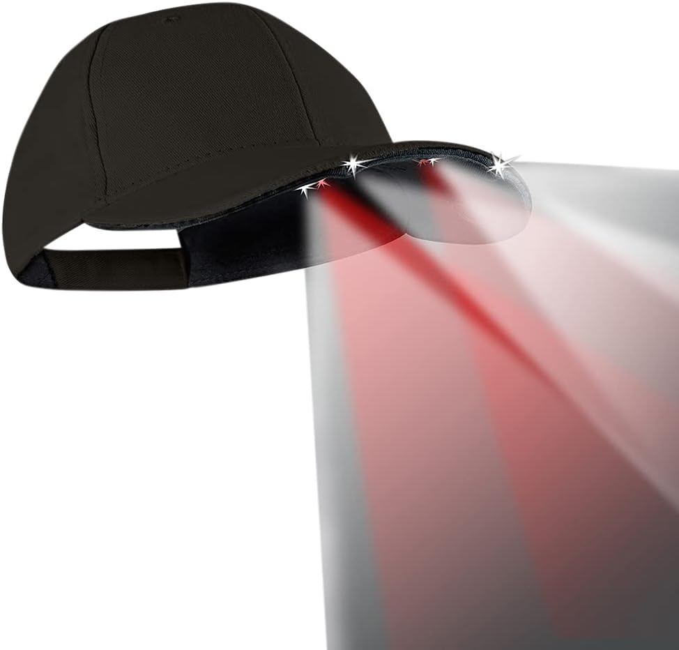 Black, 100% cotton ball cap. This hat is amazing! It has independent under-the-brim switches for White and Red LED Lighting options along with independent battery packs. It'll keep you cool during the day, and illuminated at night. Button-less design is comfortable, even while wearing a headset!6 LED design for task and distance lighting2 red LEDs under brim for task lighting/preserve night vision, 12 lumens, 13 meters light field2 white LEDs under brim for task lighting - 24 lumens, 13 meters light field2 LEDs in the brim for distance and overhead lighting, 21 lumens, 22 meters light field68 hours run timeSeparate switches and battery packs for red and white and red lighting optionsT