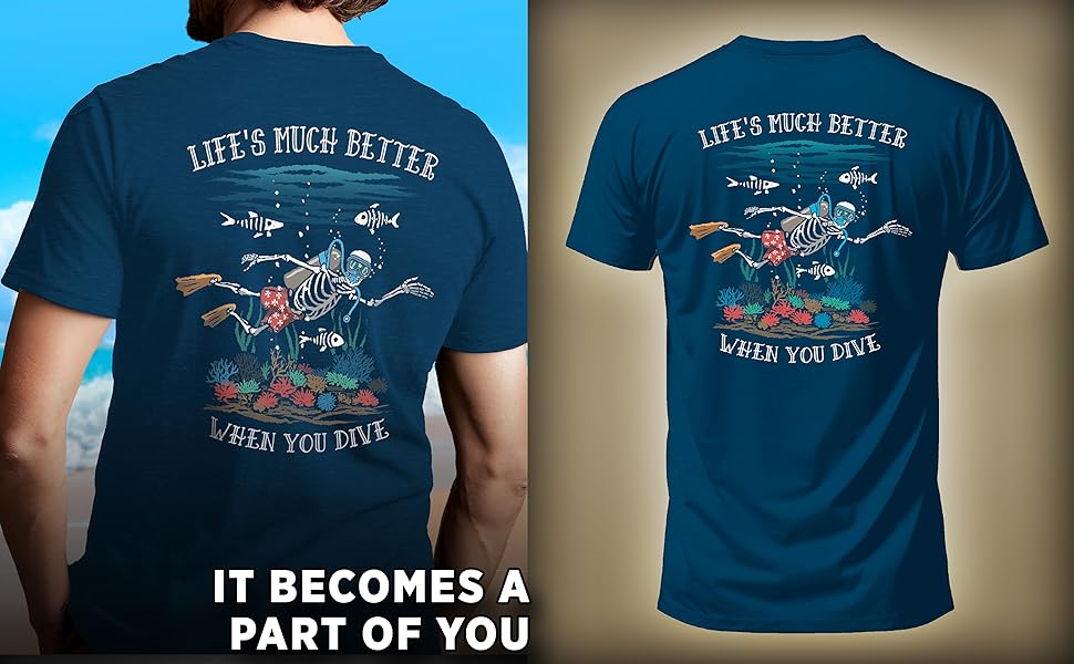 Instant Vacation Mode – Funny ocean t-shirt with a laid-back skeleton scuba diving among tropical fish and coral reefs — great shirt for scuba lovers, snorkeling trips, beach vacations, or island adventures.