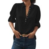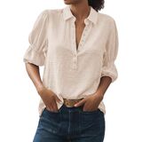 Design: Featuring a minimalist turned-down collar, double puff sleeves, and a curved hem, this updated take on the classic button down shirt transitions easily from the office to the weekend