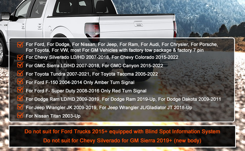 【Fit for Truck 7 Pin】ISINFLASH Dual output 4 way & 7 pin trailer wiring adapter plug allow you to use it for turn signals, brake lights, running lights and reverse light, sequential amber turn signals, sequential strobe light. Design for truck with factory OEM USCAR 7-way plug (standard USCAR socket 7-way connector). Compatible with Ford, Dodge, Nissan, Jeep, Ram, Audi, Chrysler, Dodge, Porsche, Ram, Toyota, Volkswagen and most GM Vehicles with factory tow package & factory 7 pin.