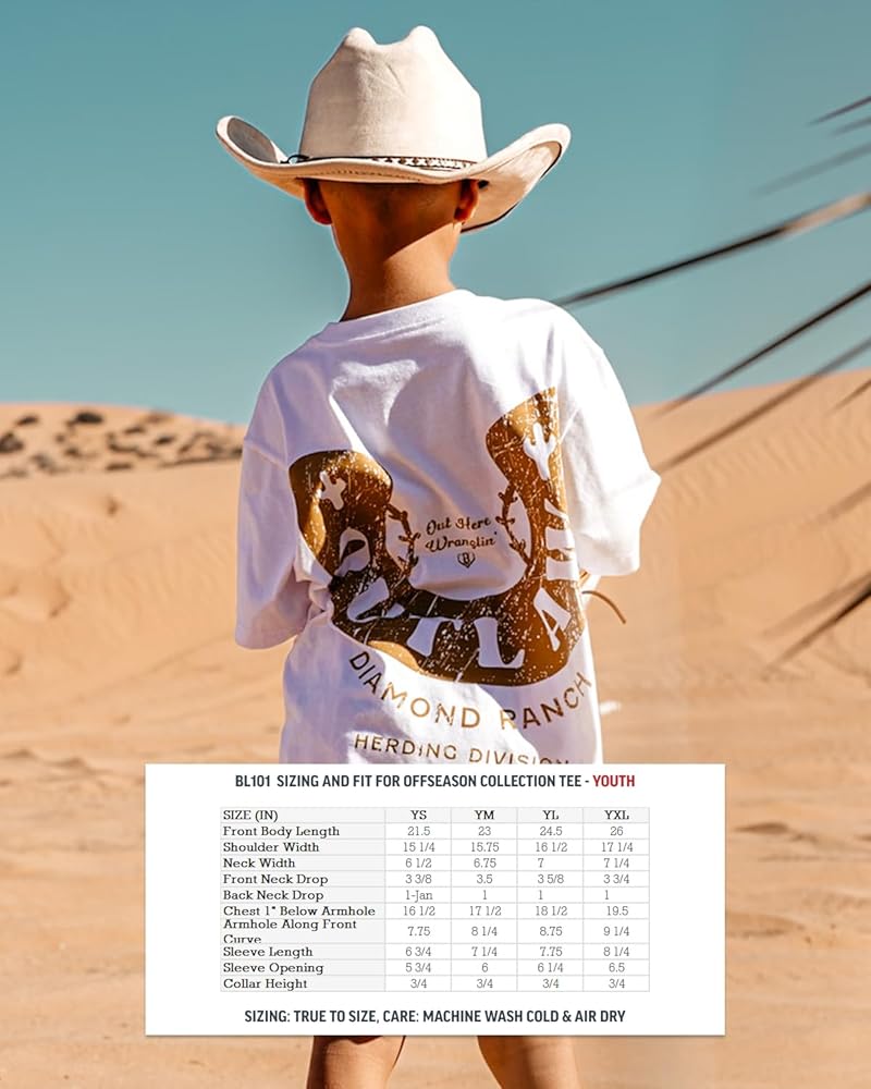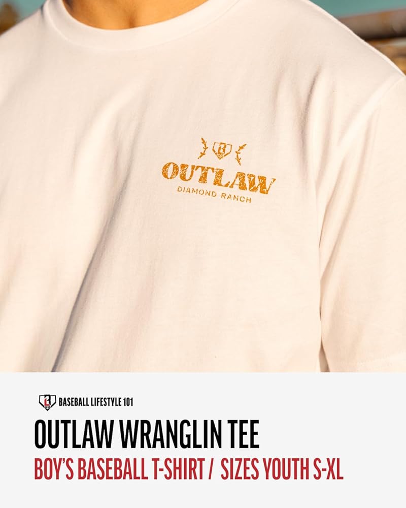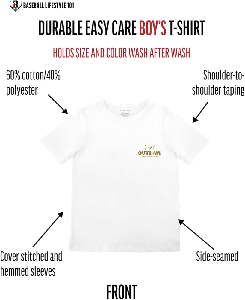 Boys short sleeve t-shirt for the ones who play by their own rules. Outlaw Wranglin tee features a classic horseshoe graphic on the back with Diamond Ranch Herding Division branding. Screen printed artwork that brings that outlaw energy to every rep because real ballplayers know the game is won with work not hype.
