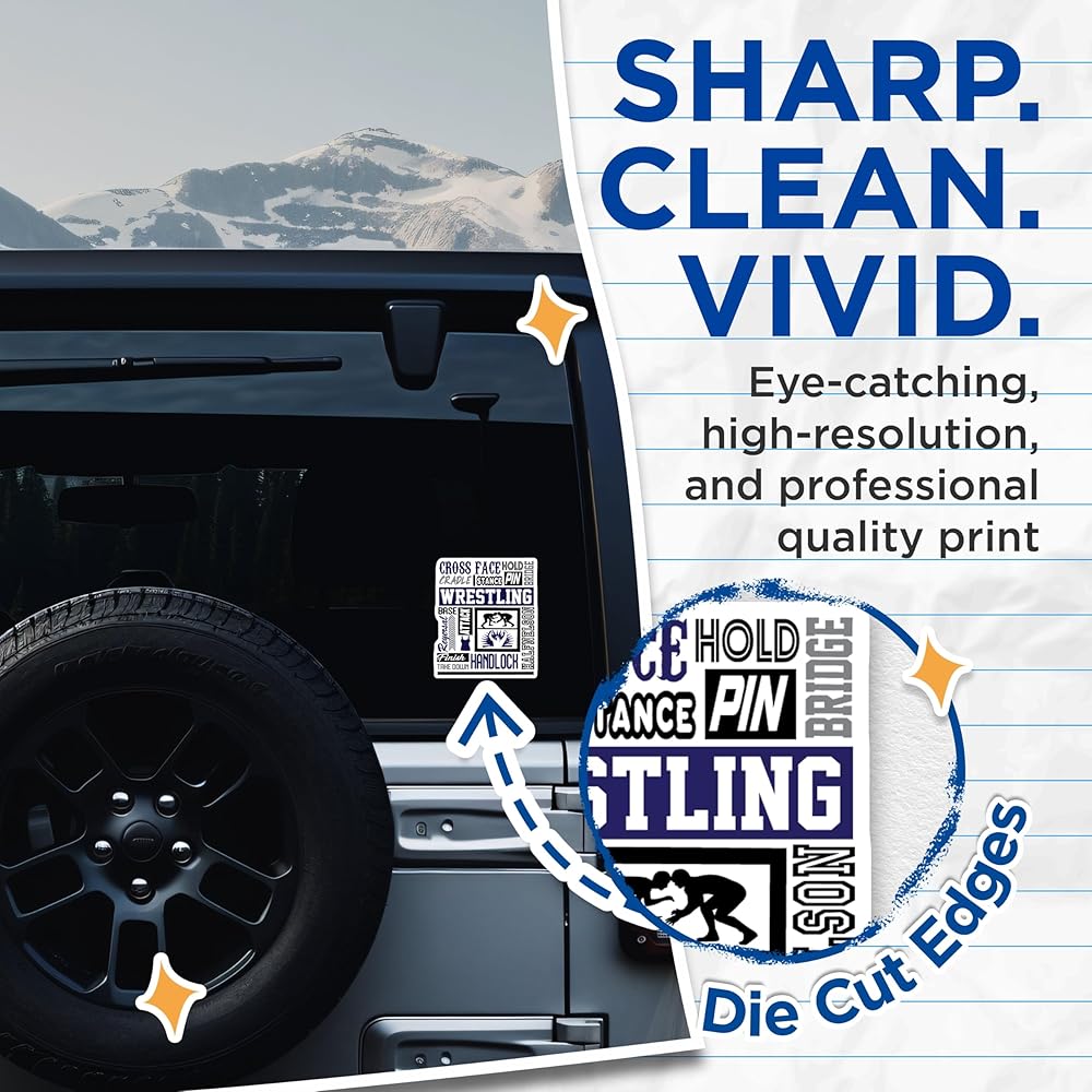 These wrestling stickers are perfect for any enthusiast of the sport. Featuring bold and motivational messages such as "Attack," "Finish," "Hold," and "Stance," these decals will inspire you during your training and matches. The designs include dynamic wrestling silhouettes and key terms associated with wrestling techniques and positions. These decals are great for displaying on water bottles, laptops, notebooks, and more. The high-quality vinyl ensures that the stickers will last, making them a fantastic addition to any wrestling fan's collection. Enhance your gear with these wrestling-themed decals and showcase your passion for the sport. Each pack contains two identical stickers to share or use on multiple items. Stickers are versatile and can be applied to a variety of surfaces, making them a great way to add some wrestling flair to your belongings.