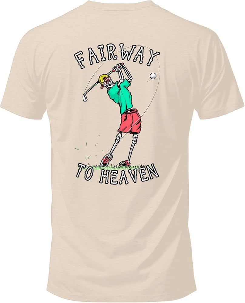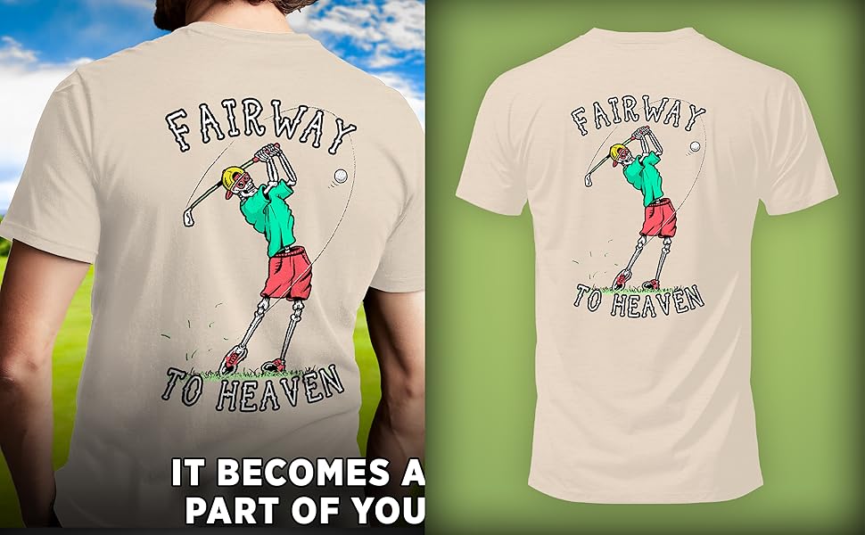 - Funny golf t-shirt with a skeleton golfer taking a swing, paired with the phrase “Fairway to Heaven” for golf lovers with a sense of humor.
