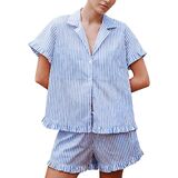 Material: The 100% Cotton y2k striped 2 piece pjs set is cute ruffle collared.