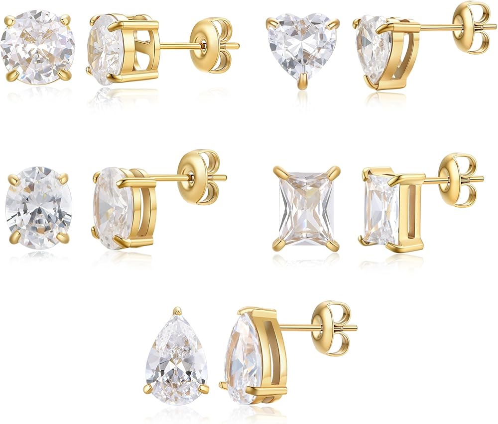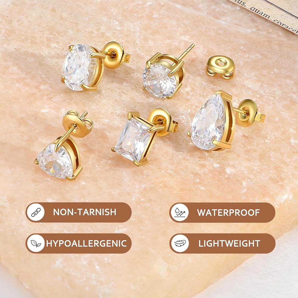 Design - These CZ stud earring sets are crafted with high - quality 18k gold plating on stainless steel, ensuring durability and a luxurious look. The big clear brilliant cubic zirconia stones add a touch of elegance and sparkle, making them perfect for various occasions, from casual outings to formal events. Each set includes five different shapes: heart, rectangle, teardrop, round, and oval, offering a versatile selection to match different styles and preferences.