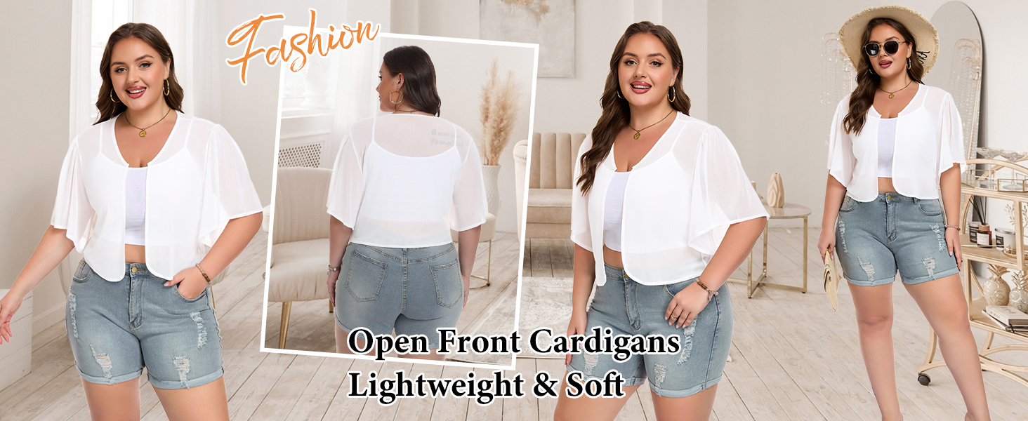 ✿MATERIAL: Women's plus size sheer shrugs are made of 95% polyester and 5% spandex, soft and lightweight fabric. This open front cardigans for women ensure you a comfortable, breathable and skin-friendly feel, even on hot days.