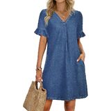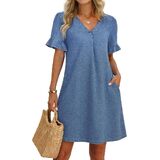 Practical Pockets of Ruffle Sleeve Denim Dress: Two practical side pockets provide convenient storage for essentials like your phone, keys, or lipstick without affecting the clean silhouette. This well-designed blue jean dress blends functionality with timeless style.