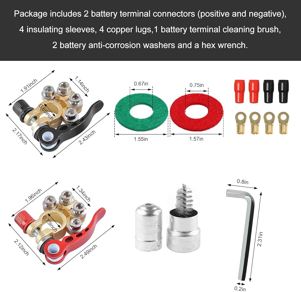 Package Includes:2 Battery Terminal Connectors, 2 Battery Anti-Corrosion Washers, 1 Hex Wrench
