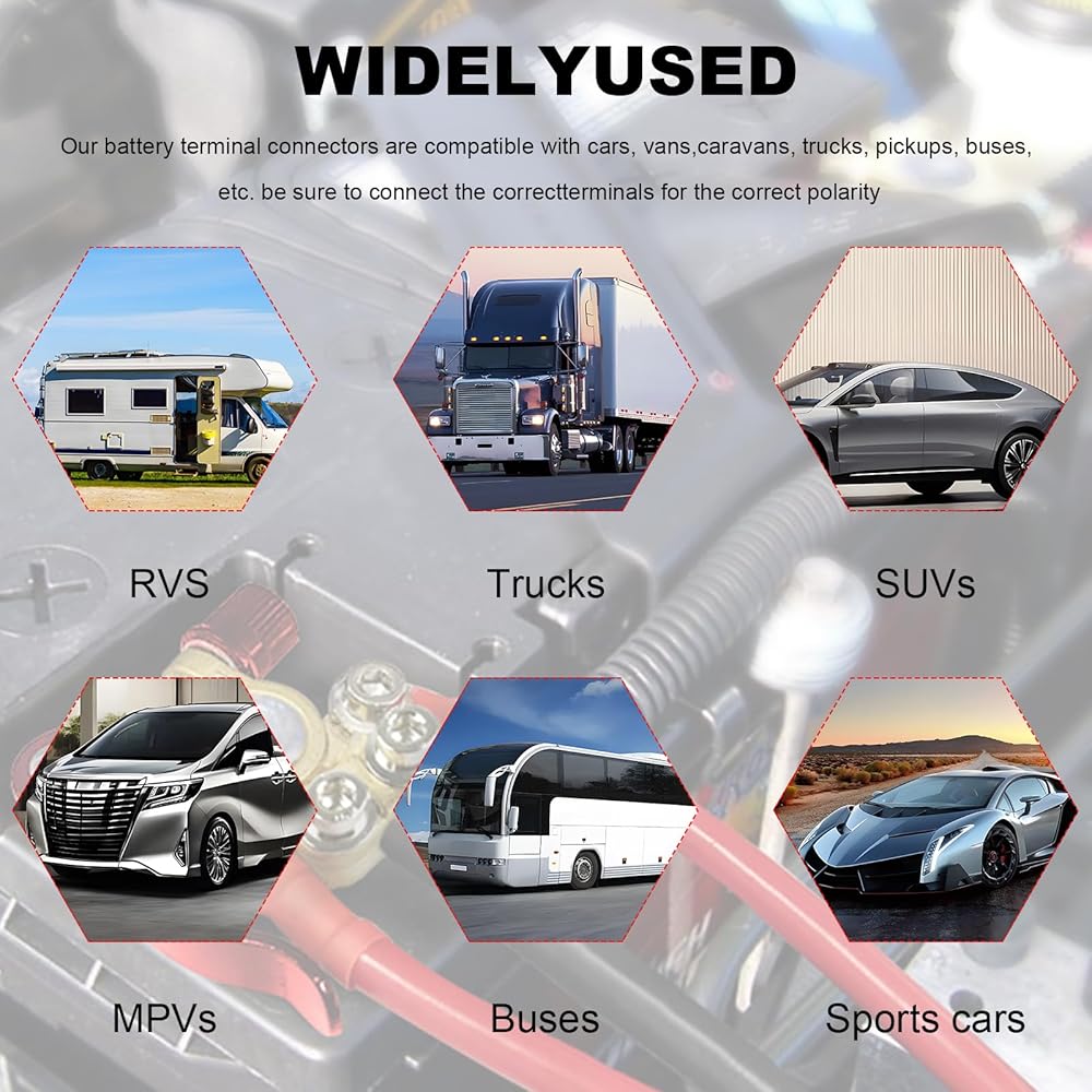 Wide Compatibility: Designed primarily for automotive batteries with round SAE/JIS A-type posts, this connector works well across a variety of vehicles including cars, vans, motorhomes, caravans, trucks, pickups, and buses. It serves as an ideal replacement for top-style battery cable terminals