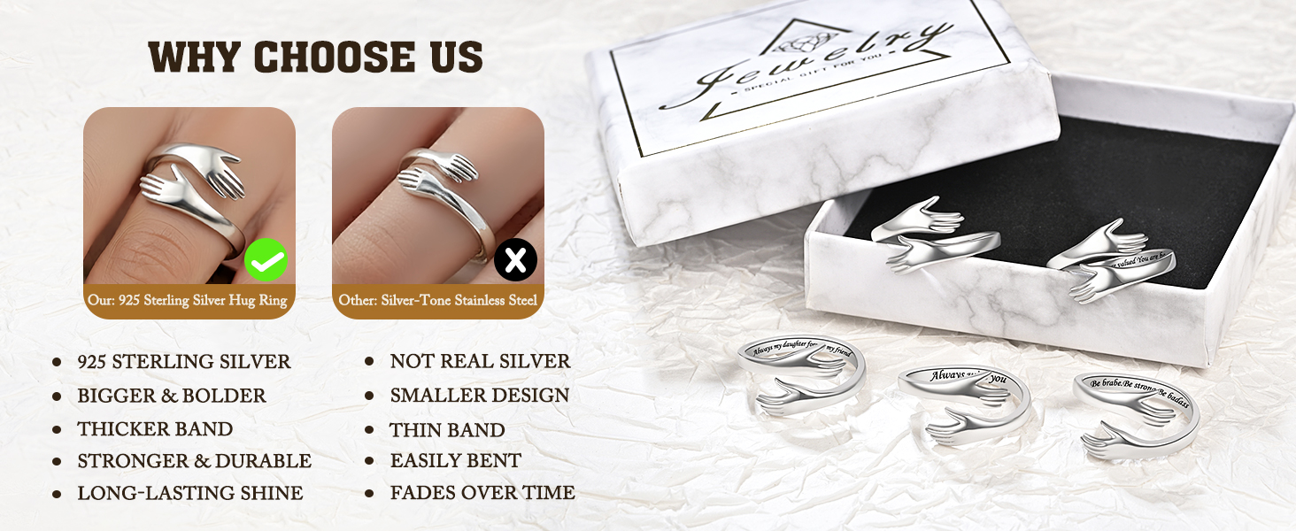 Package includes a jewelry gift box, silver polishing cloth, and message card. Gift-ready hug ring, perfect for expressing love and support