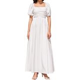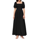 The casual dress features a timeless square neckline, paired with voluminous puff short sleeves that add a touch of feminine charm, Its high waistline flows into a full a line maxi dress, creating an elegant, elongated silhouette