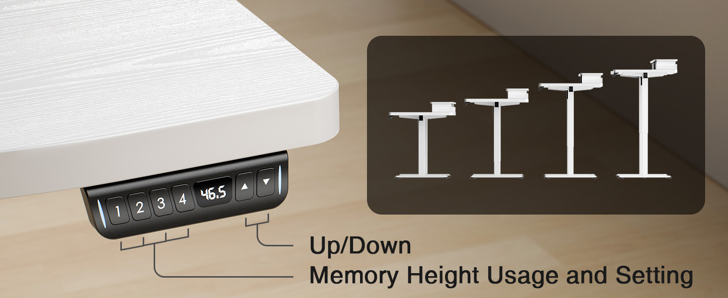 4 Programmable Height Memory Presets:Save up to 4 custom height settings and switch between working, reading, or gaming positions at the touch of a button. Quick, convenient, and tailored to your lifestyle.