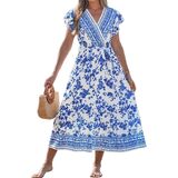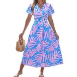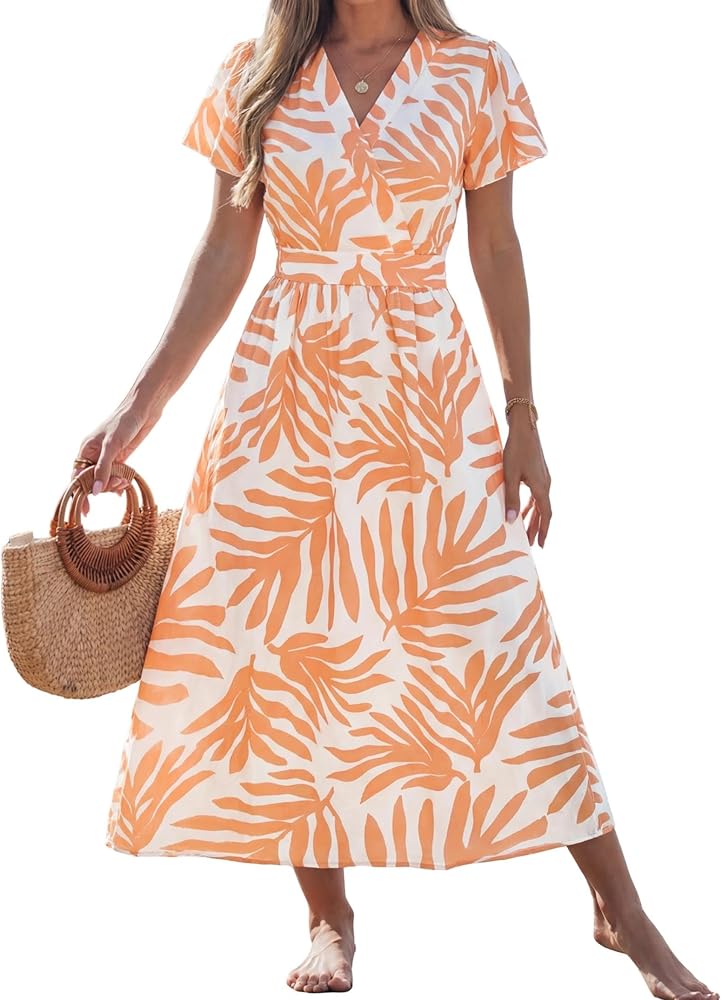 Delicate Florals – This floral dress features a tropical-inspired flower print with soft bohemian charm. The wrap V-neck and elastic waist define the silhouette, while the flowing A-line shape and flutter sleeves create a naturally slimming look with sleeves.