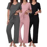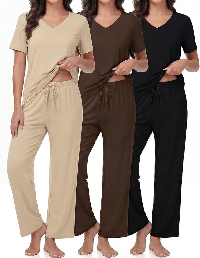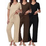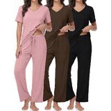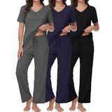 3 Pack Set: You will receive 3 pack women's pajama sets in different colors. Each set includes a fitted V-neck short sleeve top and matching loose-fit long pants, providing comfort without feeling tight. Perfect as loungewear, sleepwear, a cute birthday gift, or for postpartum recovery