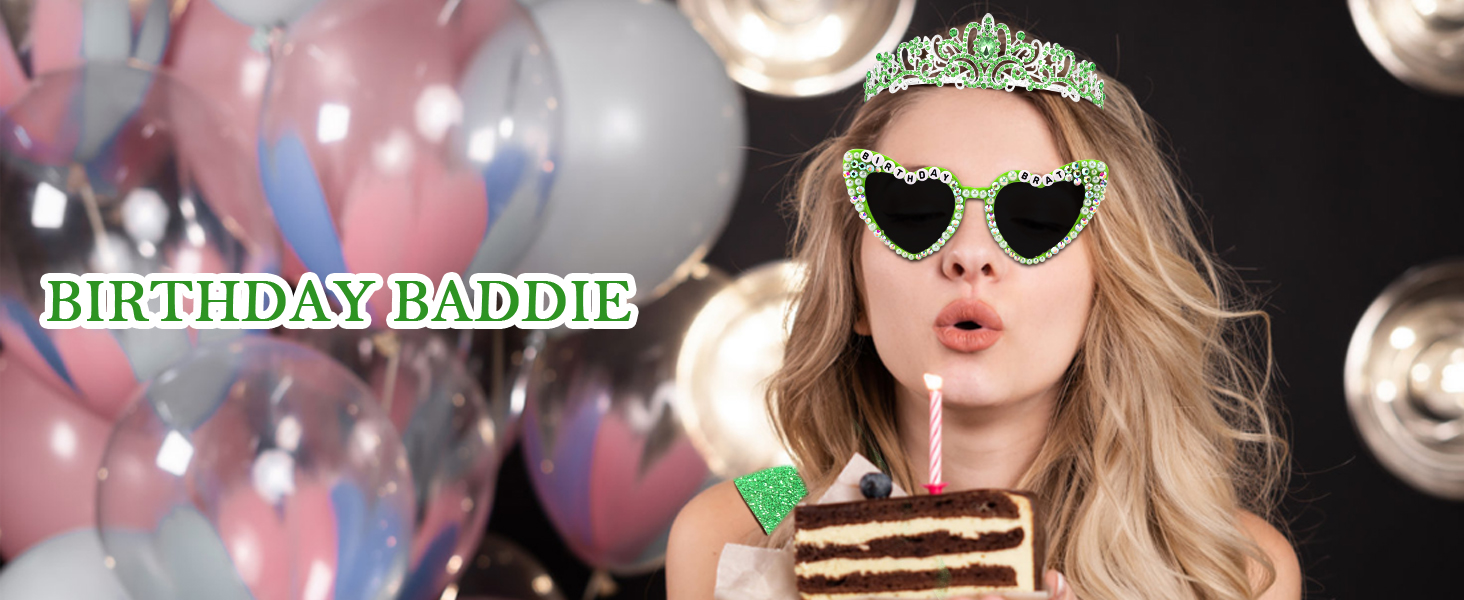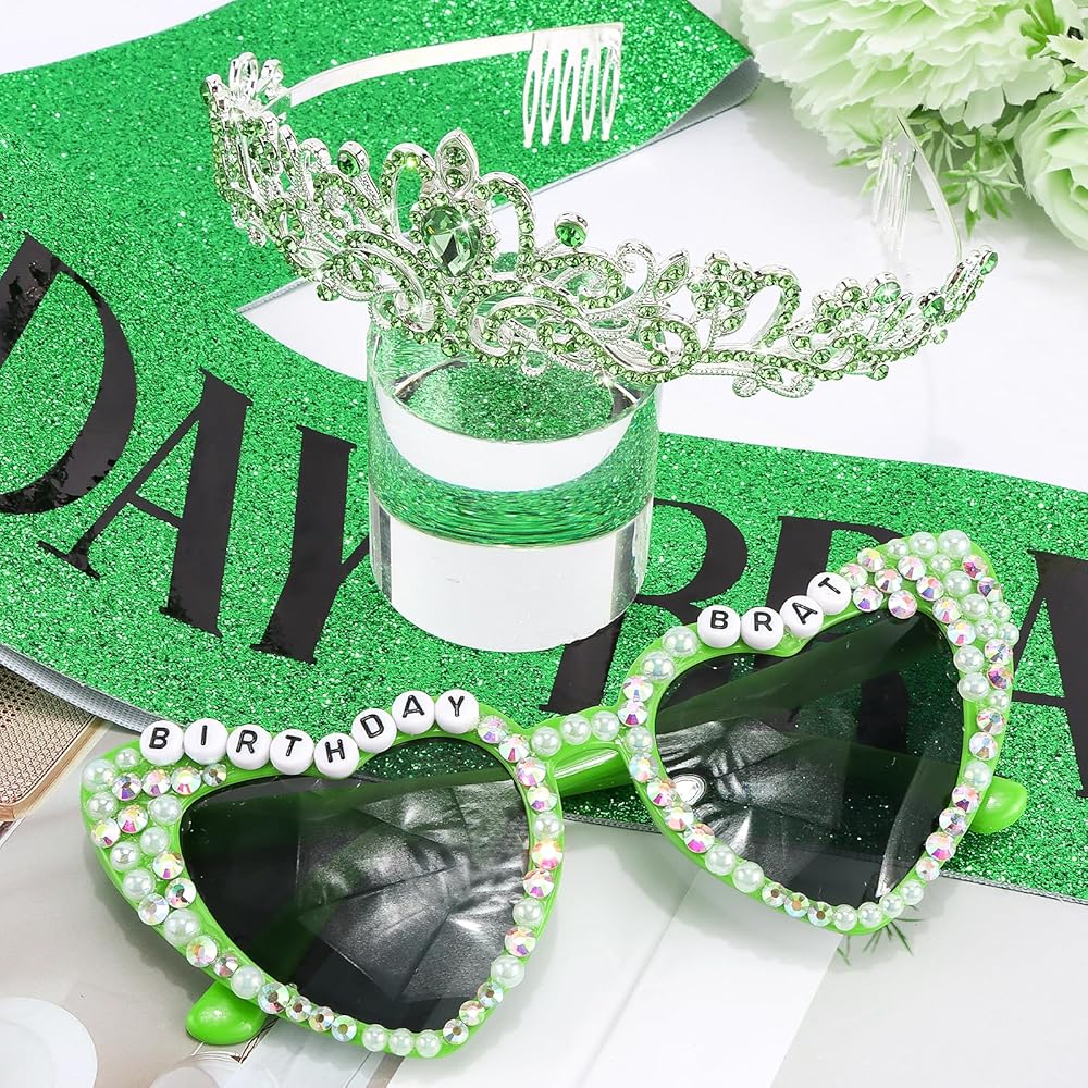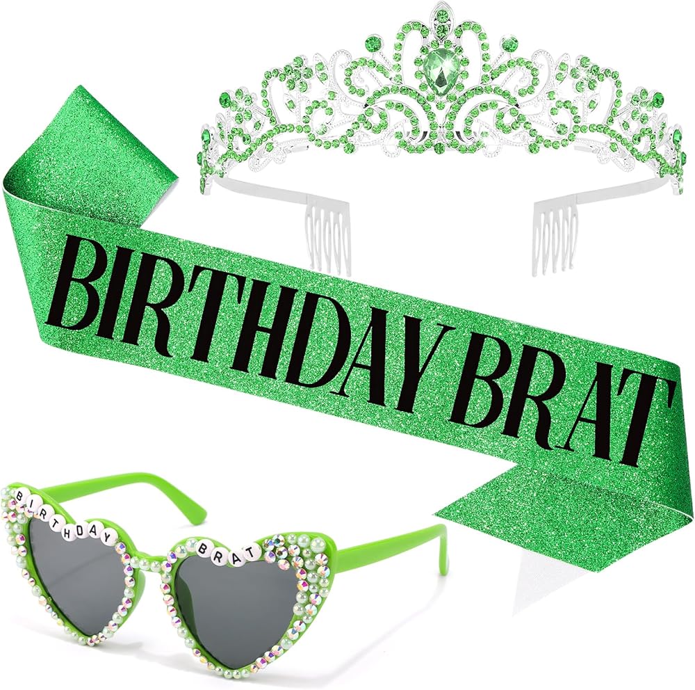 Complete Birthday Spotlight Kit:Includes a glitter green "BIRTHDAY BRAT" sash, heart-shaped "BIRTHDAY BRAT" sunglasses, and a green crystal-adorned crown — everything to make the birthday person the center of attention.