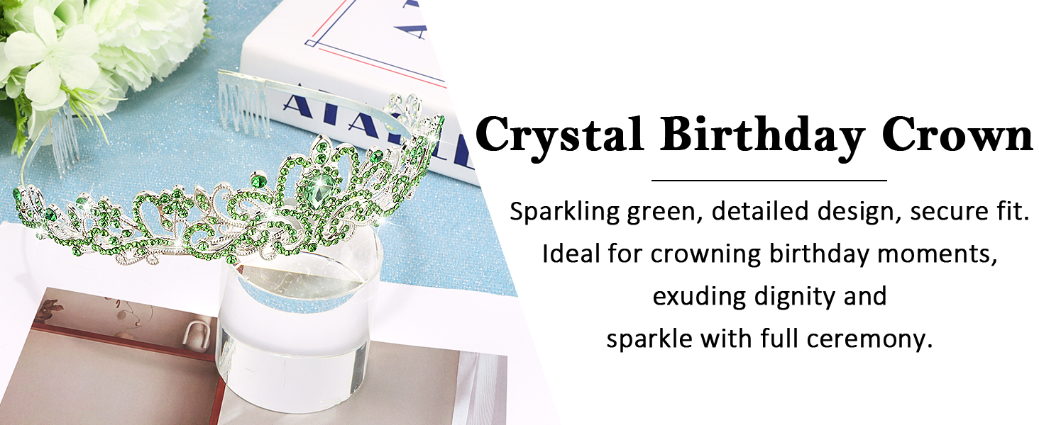 Glitzy Birthday Design:Shimmery green glitter sash, bead-trimmed sunglasses, and crystal-embellished crown add eye-catching, photo-ready flair for the big day.