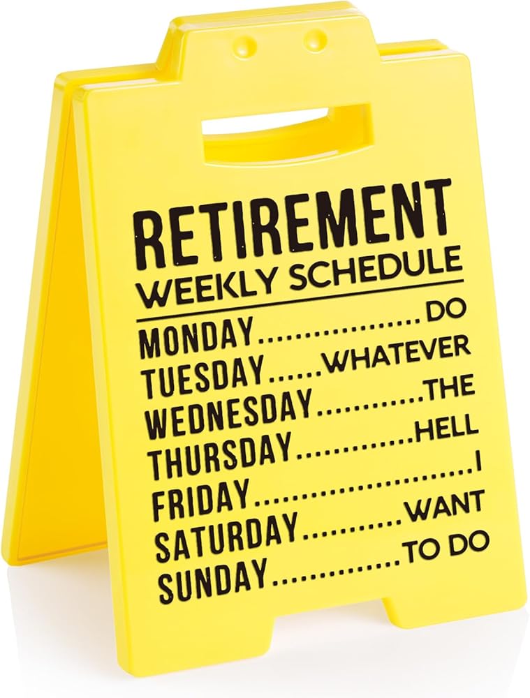 Perfect Retirement Gift for Women & Men: Celebrate retirement freedom with this hilarious yellow sign featuring "RETIREMENT WEEKLY SCHEDULE." An ideal retirement gift for woman, men, bosses, coworkers, nurses, teachers, and family members starting their next chapter. The vibrant color and witty design bring smiles while honoring years of hard work