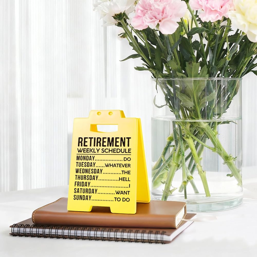 Funny Retirement Weekly Schedule Desk Decor: Measuring 3.9in x 6.3in, this compact sign fits perfectly on shelves, desks, or walls in any room. Retirees can display it in their home office, kitchen, garden shed, or reading nook as a constant reminder of their hard-earned freedom. Durable construction ensures it remains a cherished part of home decor for years