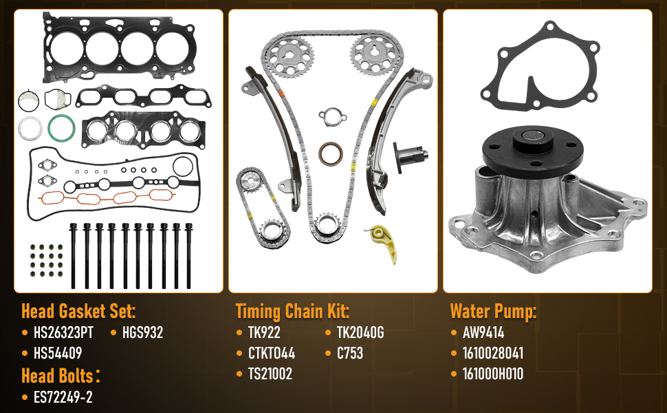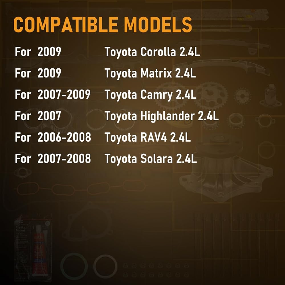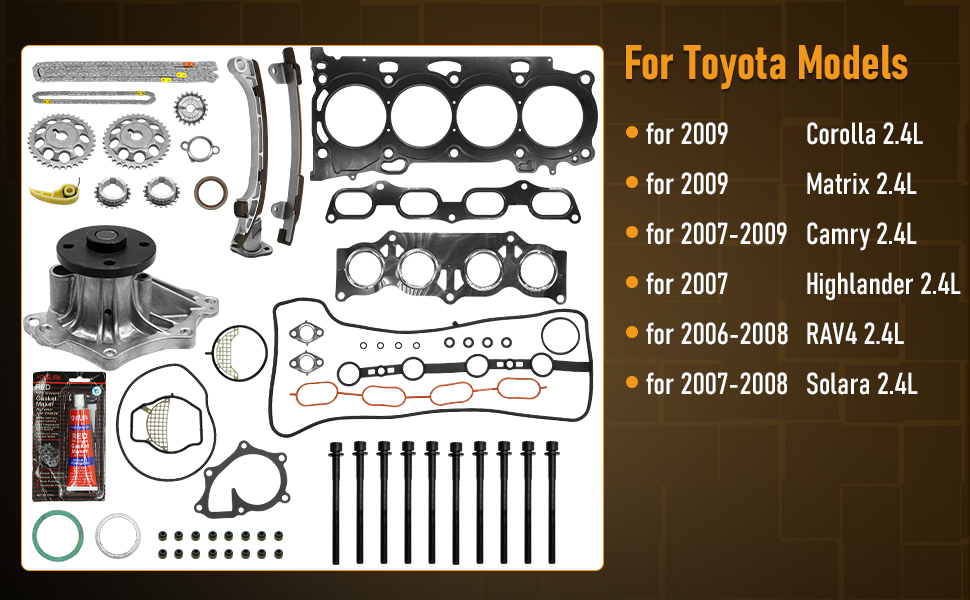 【Fitment & Application】2.4 head gasket set, water pump and timing chain kit fit for 2007-2009 Toyota Camry 2.4L, for 2009 Toyota Corolla 2.4L, for 2009 Toyota Matrix 2.4L,for 2007 Toyota Highlander 2.4L, for 2006-2008 Toyota RAV4 2.4L, for 2007-2008 Toyota Solara 2.4L.