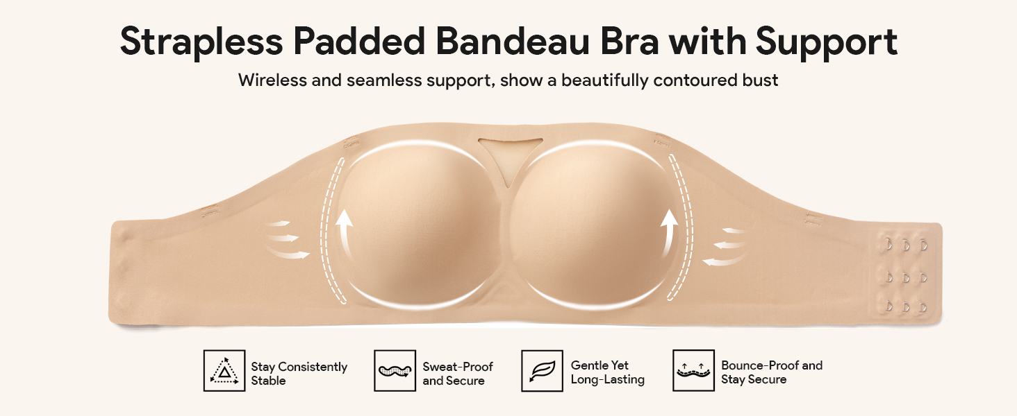 【NON-SLIP PUSH UP BRA WITH SUPPORT】: This seamless bandeau bra with non-slip silicone strips the top and bottom of the cups. Provides great support and stability for the bust. And the inner sides of the wings and back are lined with anti-slip silicone, ensuring it stays in place for a secure fit.