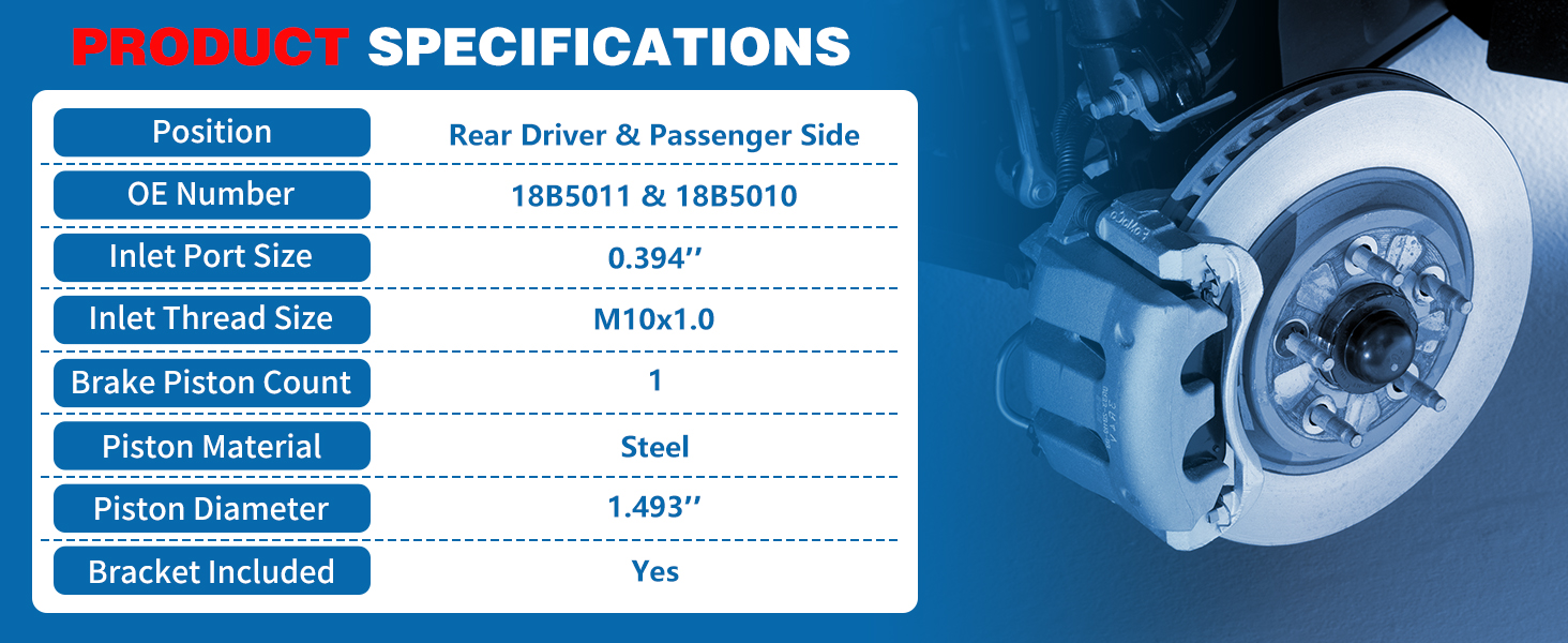 • 【Specifications】①Position: Rear Driver and Passenger Side; ②Bleeder Thread Size: M10x1.0; ③Bracket Included: Yes; ④Inlet Port Size (in): 0.394; ⑤Mounting Hole Thread Size: M12x1.75; ⑥Piston Diameter (in): 1.493; ⑦Piston Quantity: 1