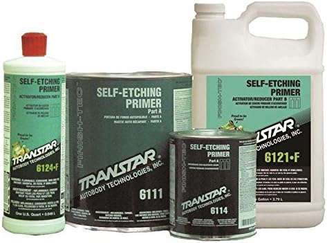1 Qt - Part#6124-F FastSelf-Etching Primer is a two part self-etching and passivating (retards corrosion process) primer. The system provides excellent protection against corrosion for bare metal, galvanized steel, and aluminum, eliminating the need for metal conditioning. The system has an easy 1:1 mix ratio and requires no induction time prior to using. Mixing 6111/6121/Acetone @ 1:1:2 complies with California S.C.A.Q.M.D. Rule 1151 for Group I and Group II vehicles for use as a pretreatment. Transtar's Self Etch Primer #6111/#6121 performs as an excellent tie coat for any top coat system when applied over unsanded E-Coat panels. Refer to product data sheet for specific instructions.