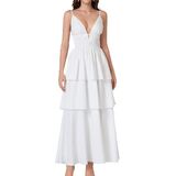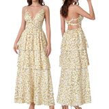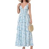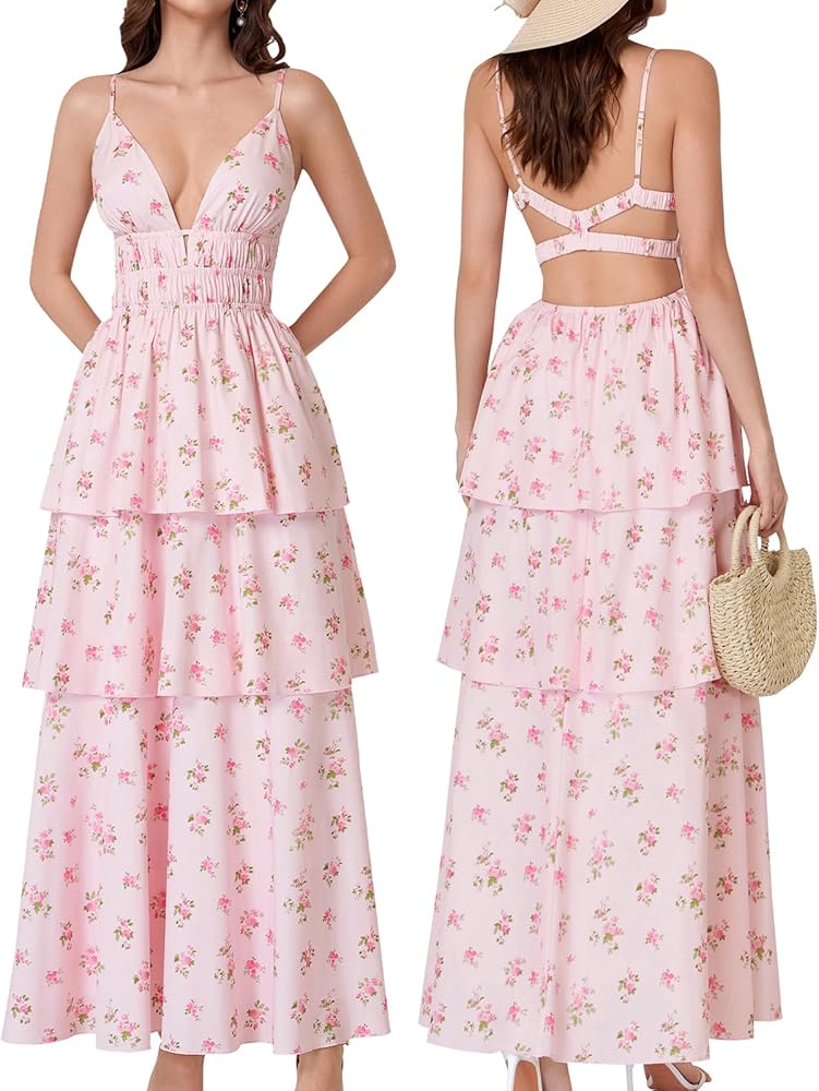 Features: This V neck maxi wedding guest dress features delicate spaghetti straps with adjustable straps, a stretchy elastic corset waist, and backless crisscross design that enhances your silhouette. The tiered A line hem creates a flattering, flowy look that moves gracefully, making it an elegant tiered maxi dress and feminine summer dress for women.