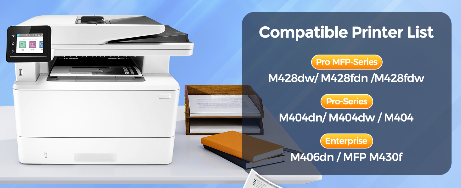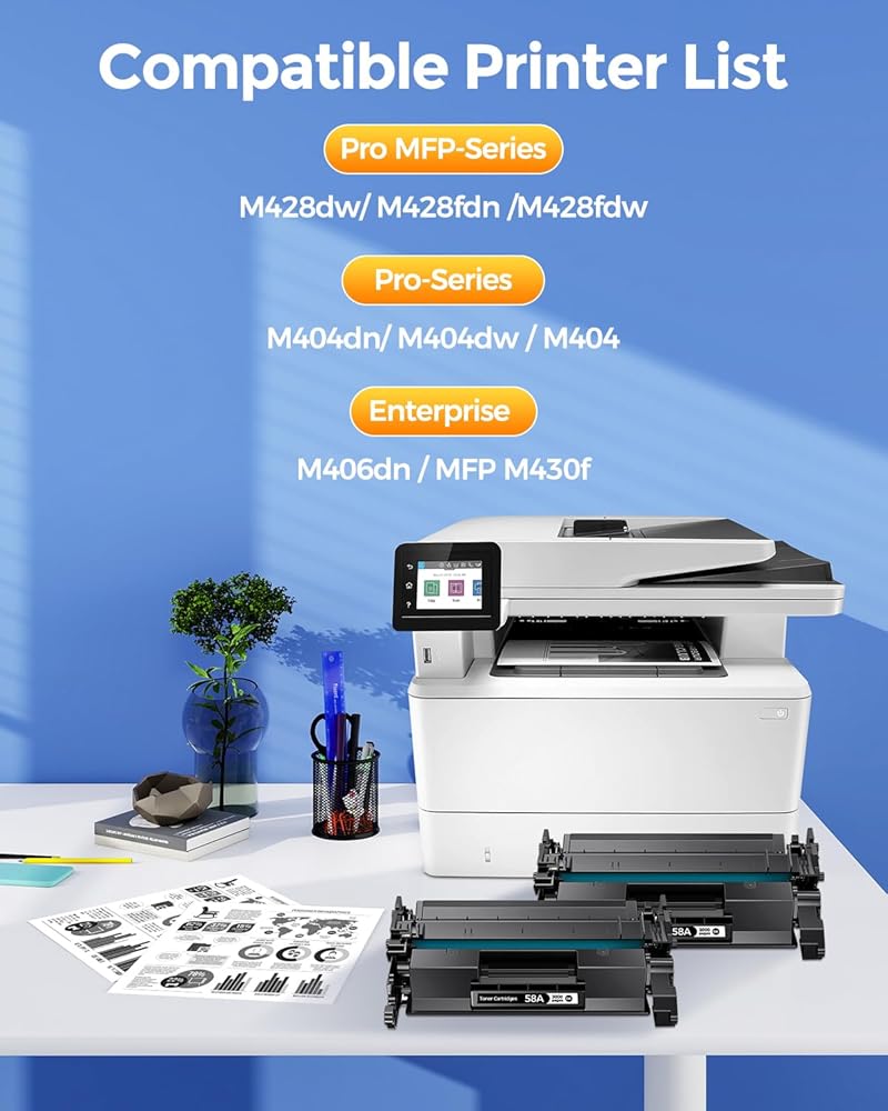 Compatibility: 58A CF258A Toner Compatible with LaserJet Enterprise M406dn; LaserJet Enterprise MFP M430f; LaserJet Pro M404dn, M404dw, M404n; LaserJet Pro MFP M428dw, M428fdn, M428fdw