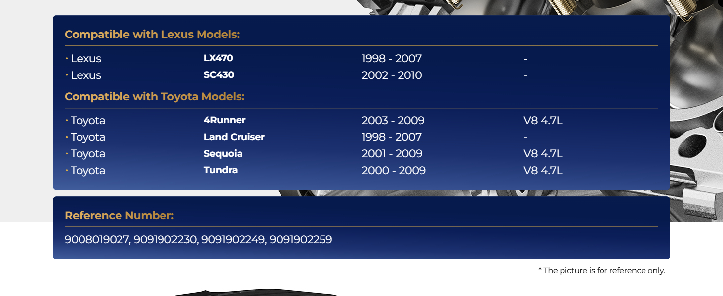 [Compatibility] - Compatible with Toyota Tundra 00-09, 4Runner 03-09, Land Cruiser 98-07, Sequoia 01-09, Lexus LX470 98-07, GX470 03-09, LS430 01-06, GS430 01-07, LX 98-07 - 4.3L 4.7L