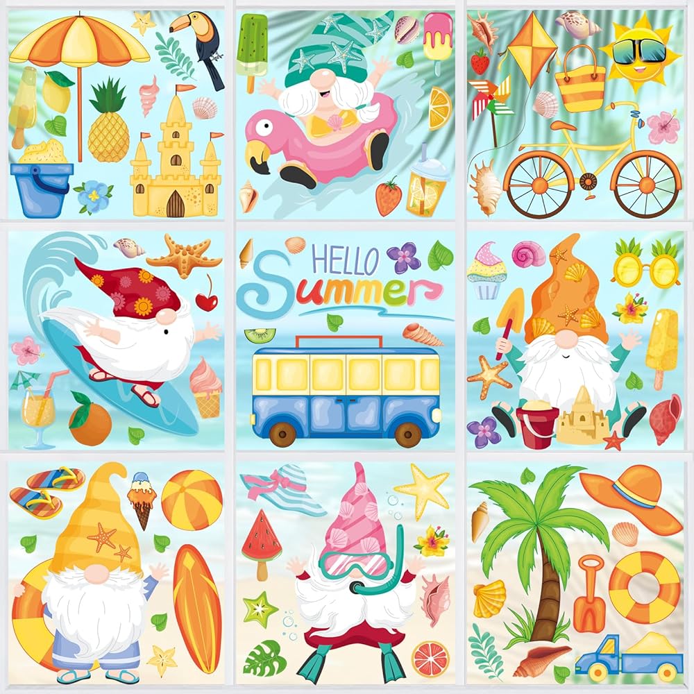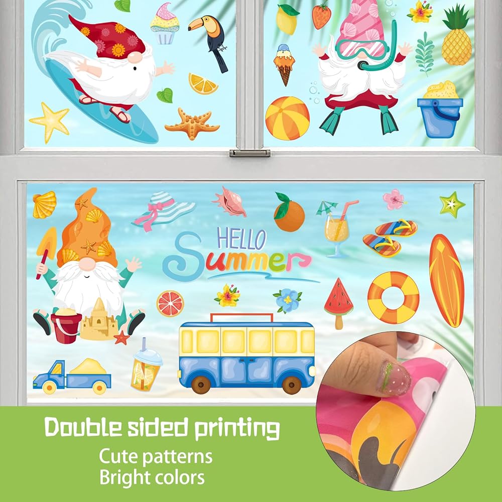 • 🧉【Double Sided Design】:Summer window clings for glass windows are designed with double sided printing, both sides are beautifully patterned and look more attractive. Put these eye-catching summer gnome window clings on your windows, boys and girls will become excited, and the brightly coloured summer window decals will also make it easy to kick off your summer pool beach party.