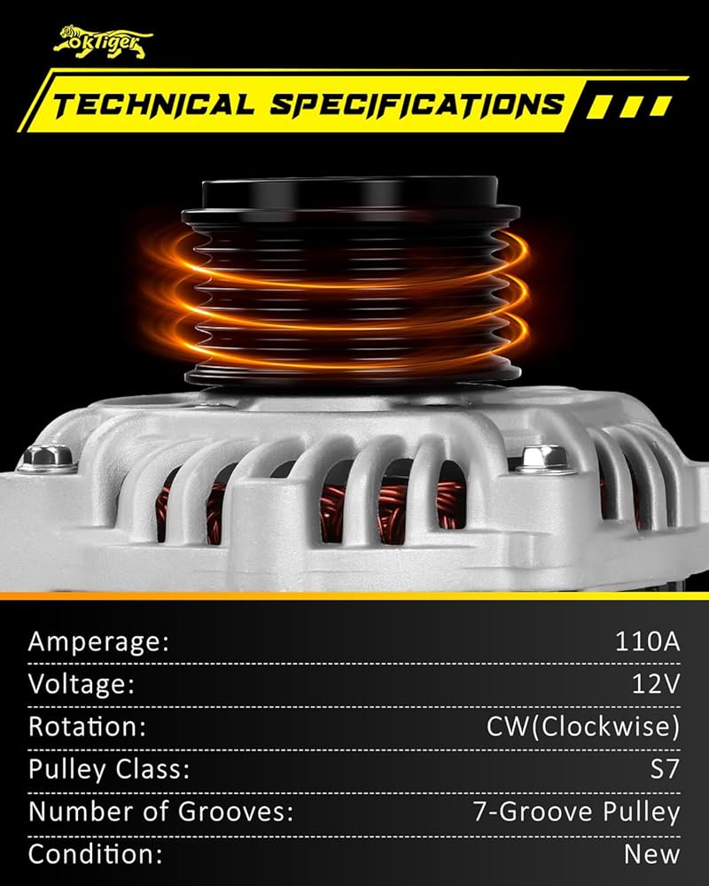 Quiet Operation & Efficient Design: Oktiger alternators feature upgraded bearings and double-lipped seals designed to reduce friction, vibration, and noise. The efficient construction helps minimize power loss for optimized vehicle electrical performance