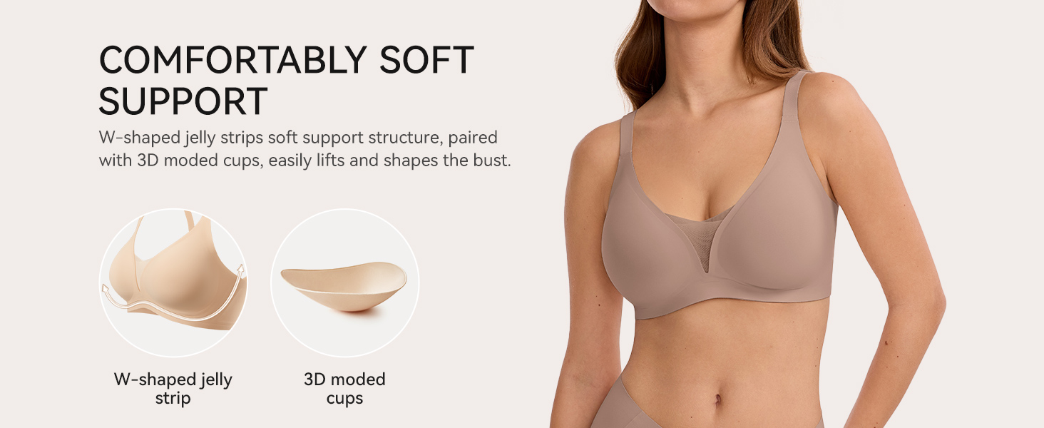 "W" JELLY STRIPE WIRELESS BRA: LUCKMEEY bras for women no underwire designed with "W” shaped “jelly strips” to support and lift the bust 360°. Our plus-size bras with support are paired with semi-fixed padding to fit a variety of bust shapes seamlessly. The breast pads create a naturally rounded, fuller shape for younger women and provide ultimate comfort and support for older women. CARE INSTRUCTIONS: HAND WASH OR MACHINE WASH IN A LAUNDRY BAG.