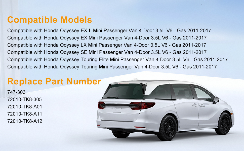 Compatible Models: Power sliding door motor assembly w/cable is designed specifically fit for Honda Odyssey EX/EX-L/LX/SE/Touring/Touring Elite 3.5L V6 Gas 2011-2017,replace part number 72010-TK8-305 72010-TK8-A01 72010-TK8-A11 72010-TK8-A12