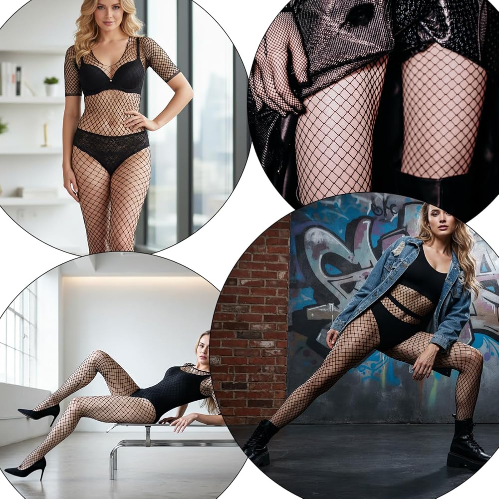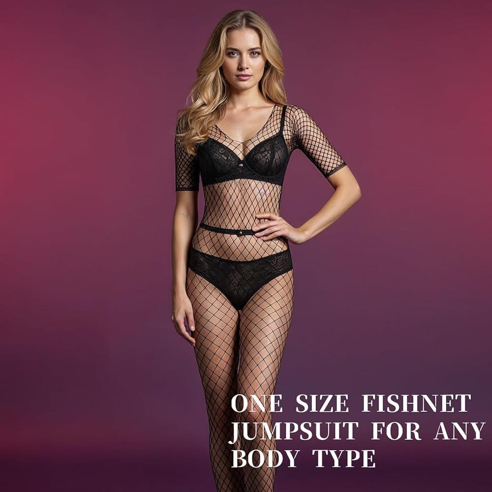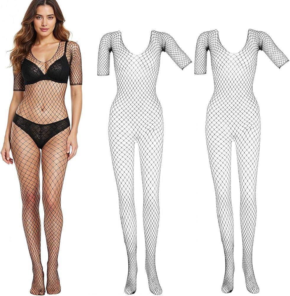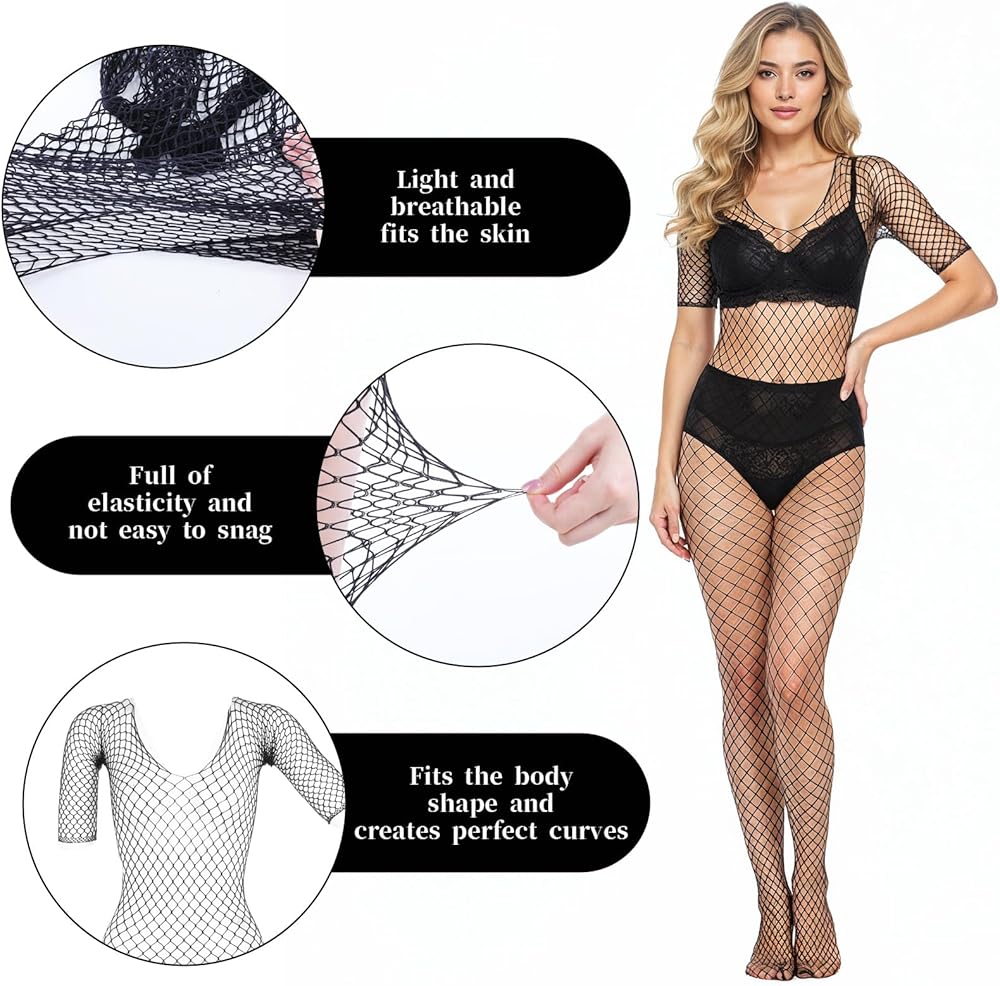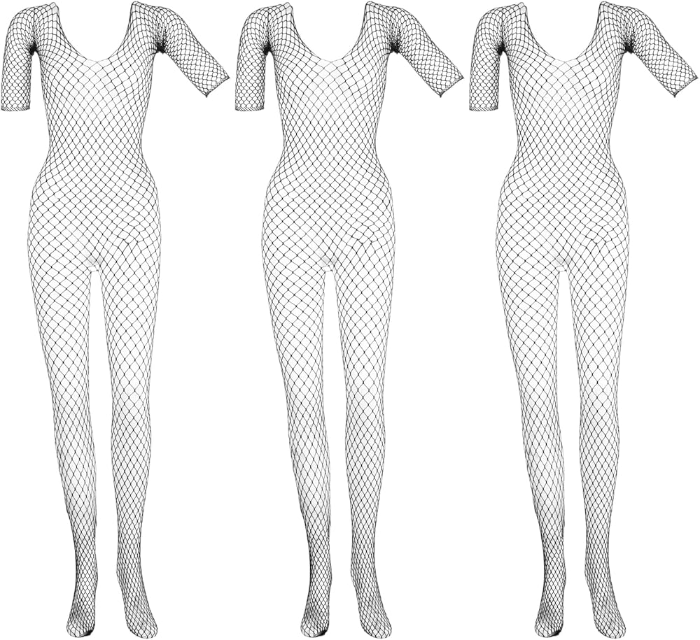 3Pcs Women Lingerie Fishnet Bodysuit Sparkle Rhinestone Sexy Mesh Lace BodyStocking Fishnet Lingerie Long Sleeve Mesh Teddy Lingerie for Romantic Date Wearing Underwear One Size