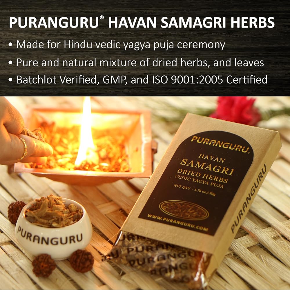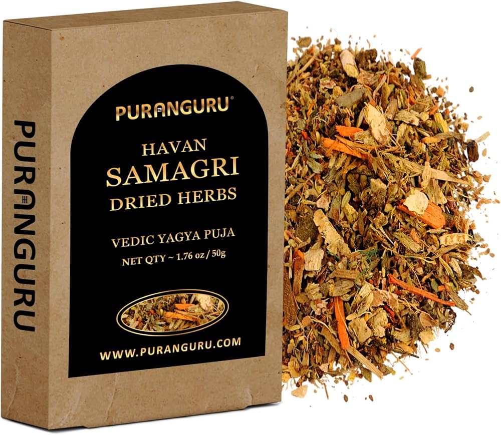 PuranGuru Havan Samagri for Puja | 50g/1.76 oz | Vedic Yagya Puja Hawan Samagri | Fragrant Natural Dried Herbs for Burning | Home Havan Kund Homam Samagri | Energy Cleansing, and Spiritual Protection