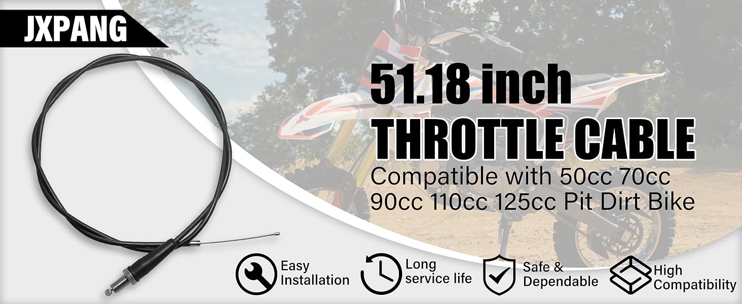 【Extensive Compatibility】: This 51.18 inch/1300mm throttle cable is engineered to provide a precise fit for a wide range of 50cc, 70cc, 90cc, 110cc, and 125cc Chinese pit dirt bikes.It is compatible with popular models from SSR, Tao Tao (DB14, DB17, DB20, DB24, DB27), Baja (Dirt Runner, DR70, DR90, DR125), Coolster, Apollo, Roketa, X-Pro, SYX Moto, Moto X-Treme, and MadMax QG-210.Please check your bike's model and original cable length before ordering to ensure a perfect match